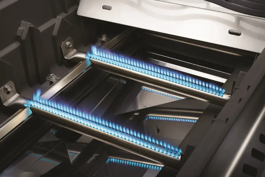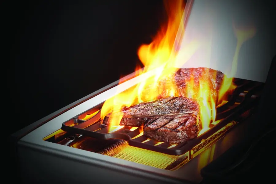 - Боковая инфракрасная горелка SIZZLE ZONE™ 4,5 кВт. разогреется до 980 °С. за 30 секунд. Это очень удобно, когда Вы готовите стейки или хотите быстро обжарить продукт, не задействуя основную рабочую зону. Переместите чугунную решётку боковой конфорки в верхнее положение и готовьте при обычном температурном режиме;
