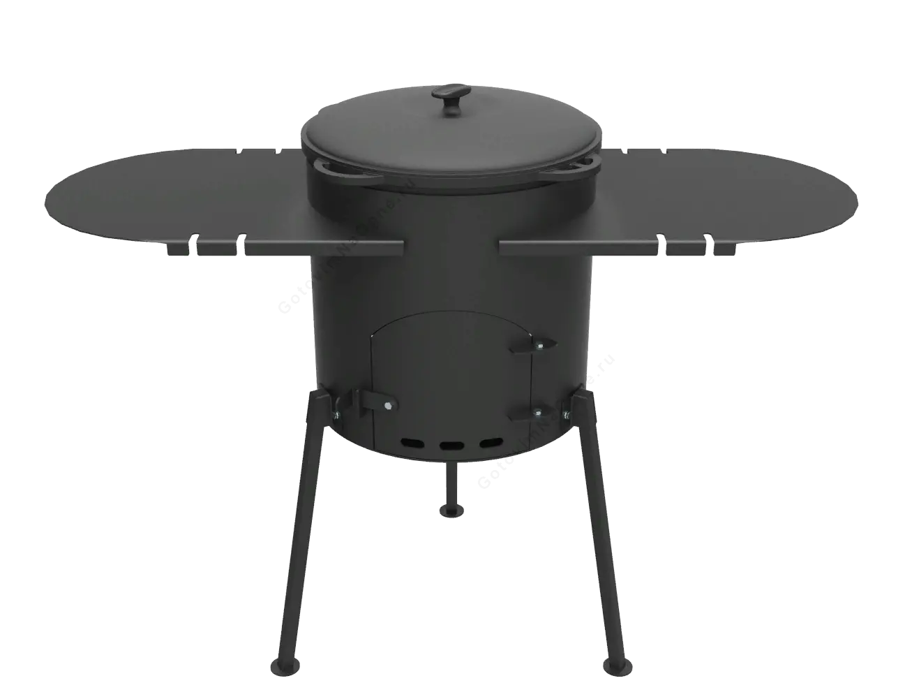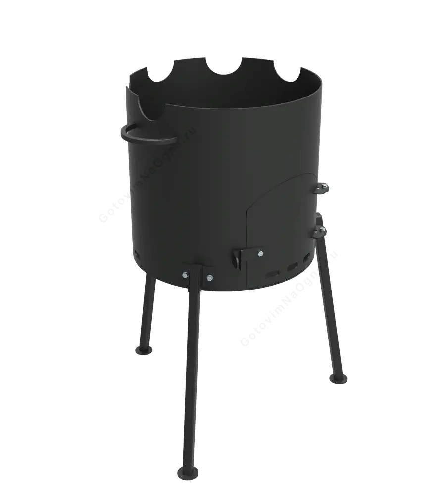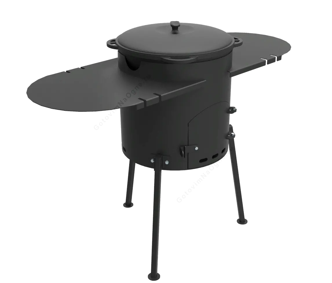 - Разборные ножки имеют плоское монтажное основание. Печь с казаном на 3 точках опоры будут ровно стоять на земле и не углубляться.