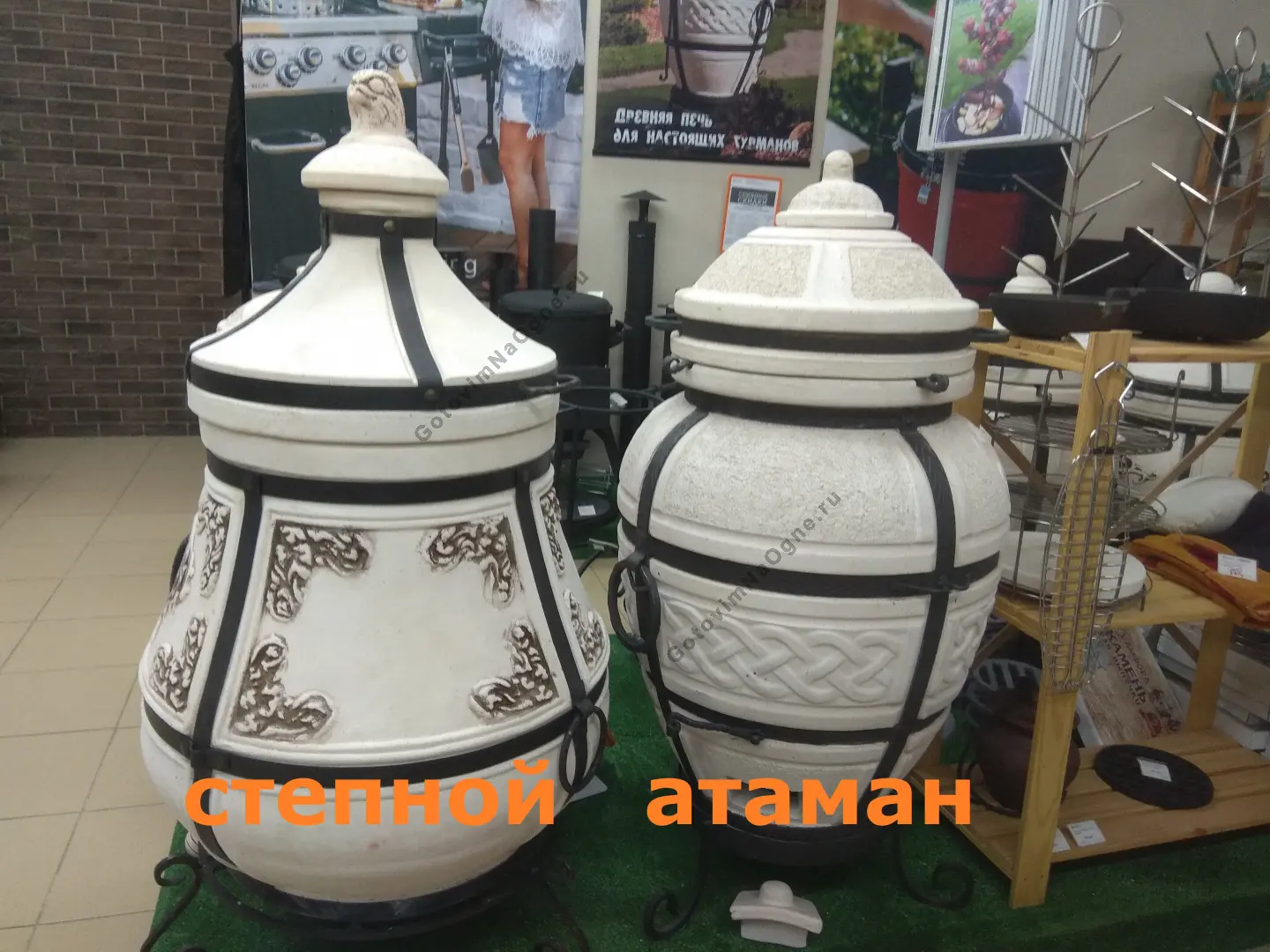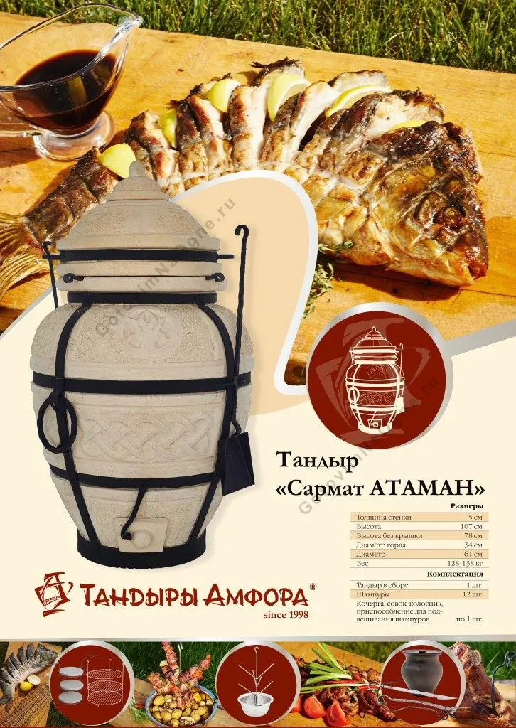 Тандыр "Атаман" имеет вес 140 кг., 12 кованых шампуров из нерж. стали, толщина стенки 5 см. Большой диаметр горловины - 35 см.