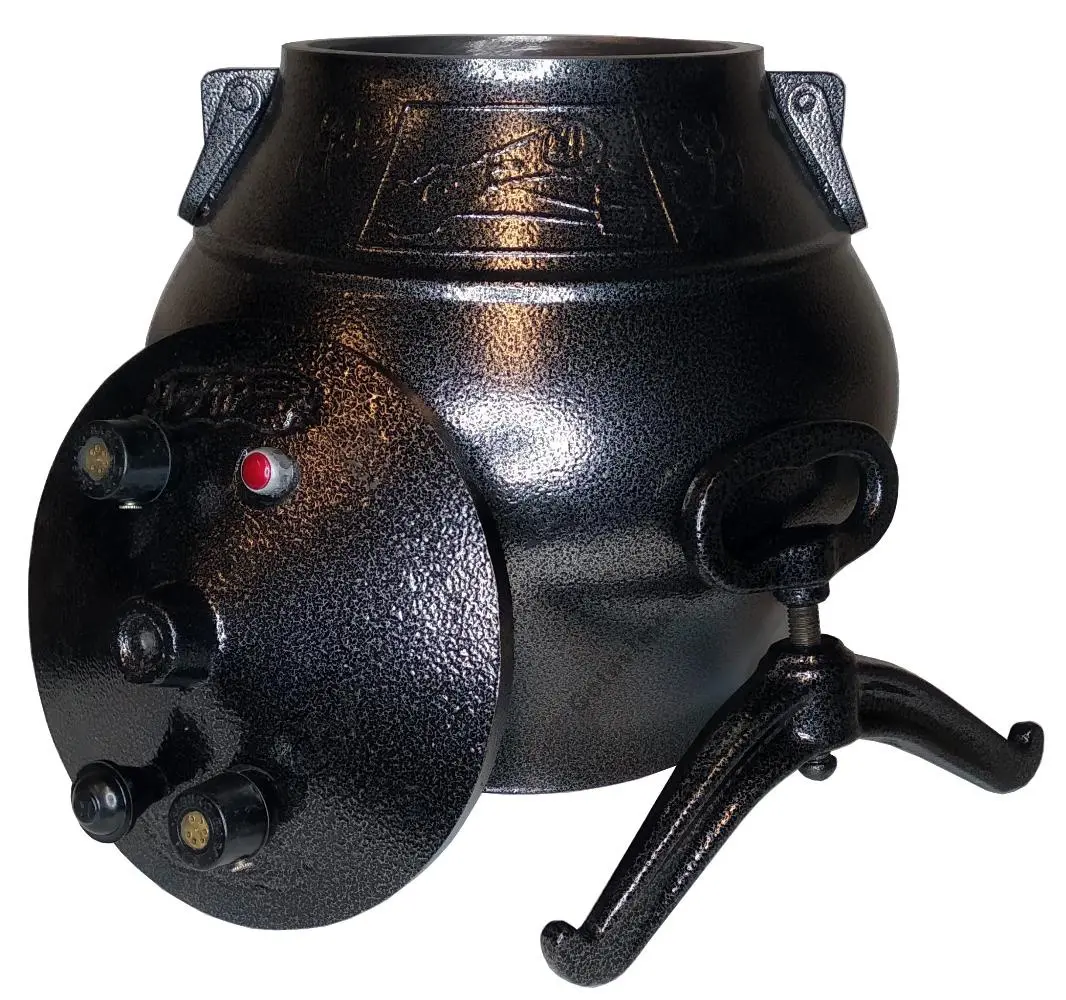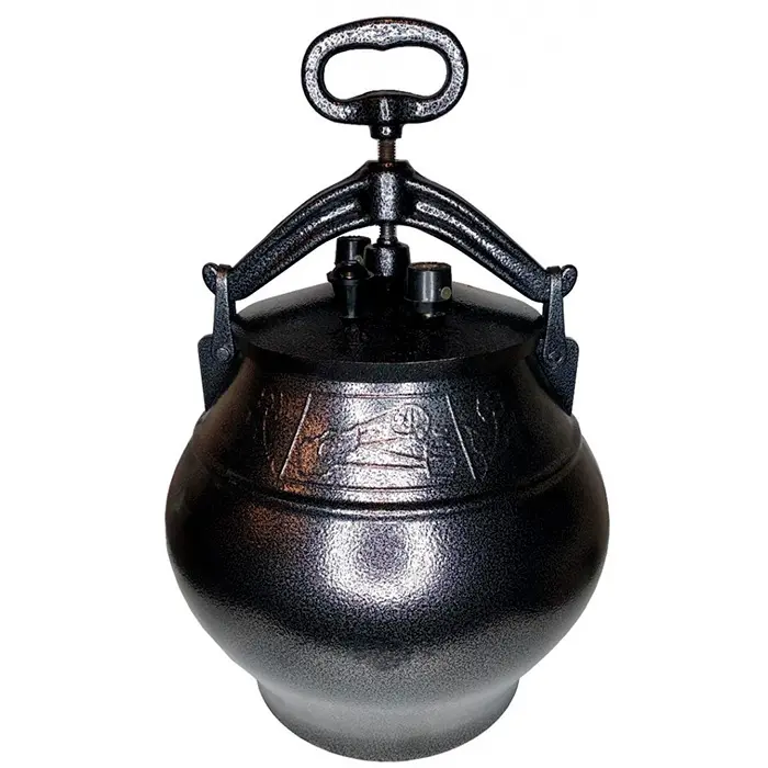 Казан представляет собой толстостенный котелок с герметичной крышкой, изготовленный из алюминия. Крышка фиксируется на казане прижимной планкой с винтовым зажимом. В ней находятся рабочие клапаны для стравливания пара, а также резервный клапан, который обеспечивает безопасность при использовании казана.