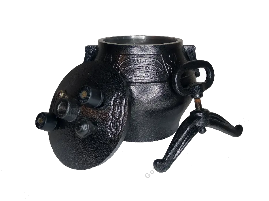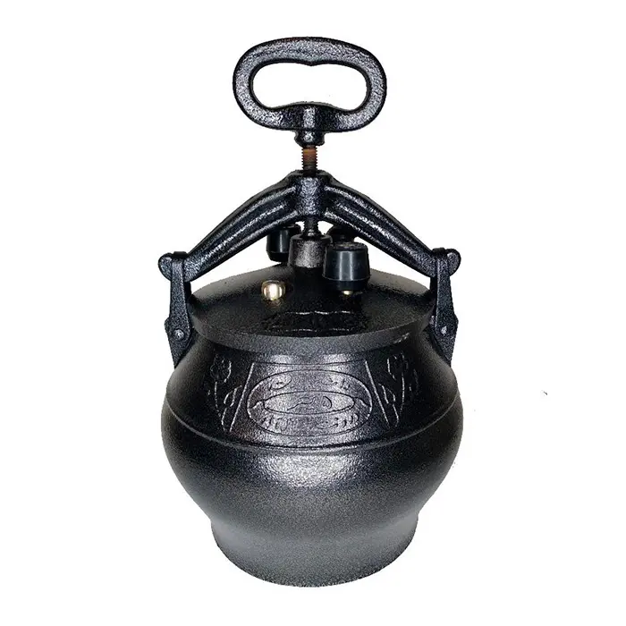 Казан представляет собой толстостенный котелок с герметичной крышкой, изготовленный из алюминия. Крышка фиксируется на казане прижимной планкой с винтовым зажимом. В ней находятся рабочие клапаны для стравливания пара, а также резервный клапан, который обеспечивает безопасность при использовании казана.