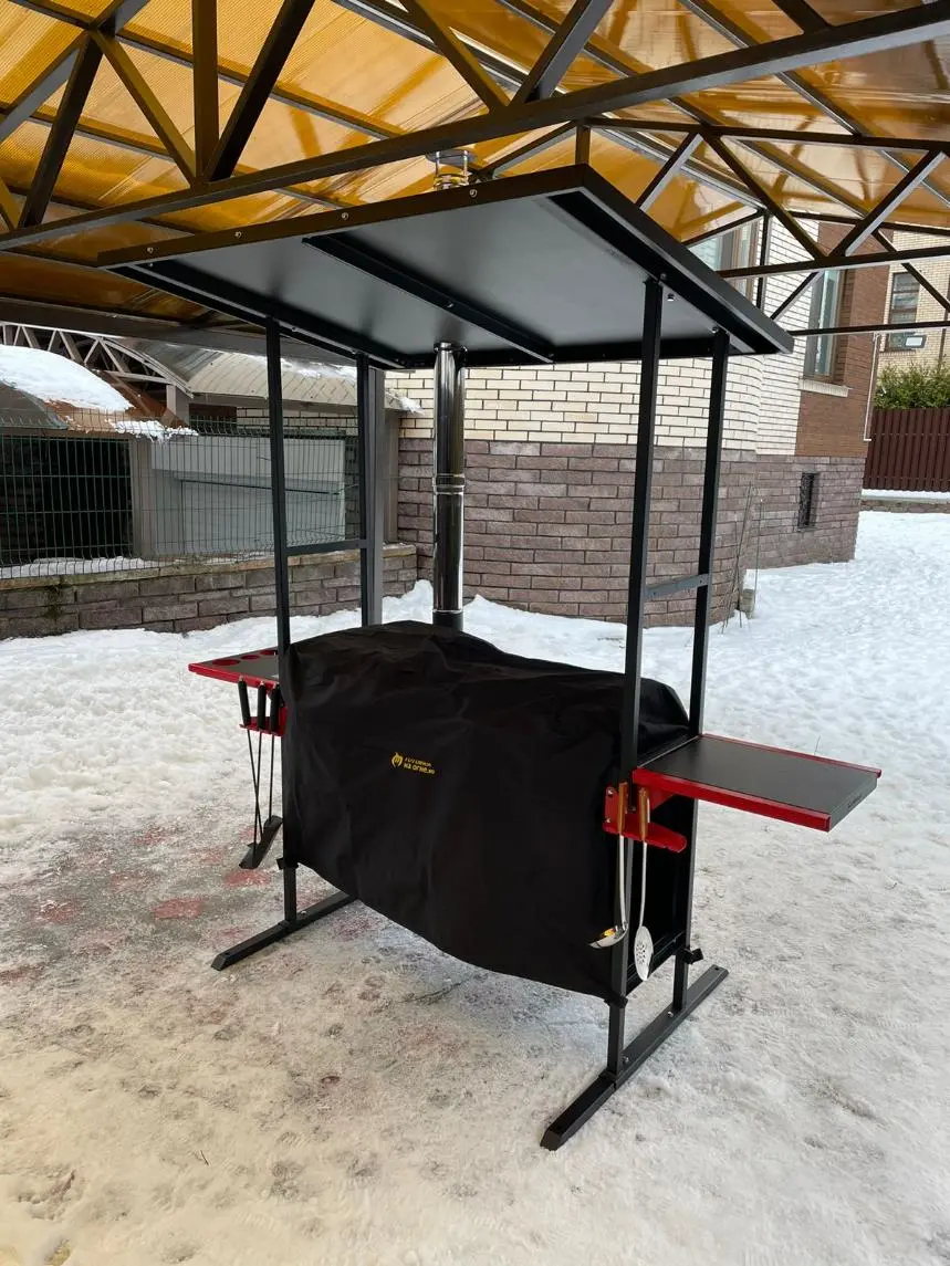 Чехол для гриль-печи Искандер Инклайн 400 и Инклайн Эйр с крышей. Плотная ткань Oxford 600. Для фиксации чехла предусмотрены фастексы по бокам, которые стягивают чехол и защищает от ветра. Защищает топку и дровницу.