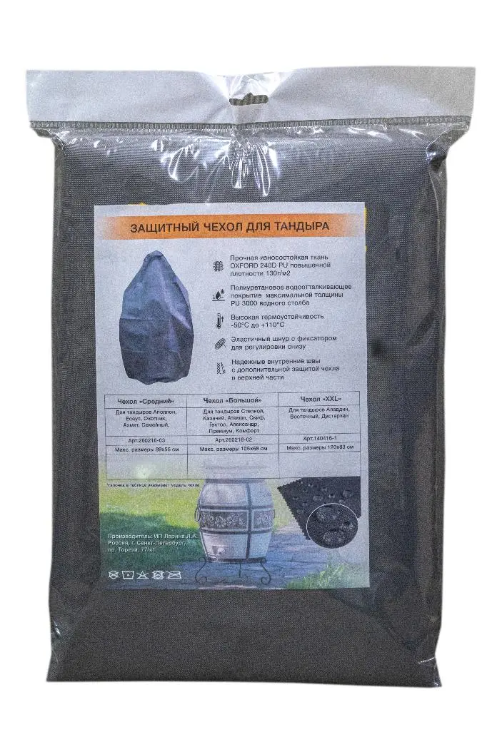 Благодаря повышенной плотности ткани, надёжным внутренним швам и полиуретановому водоотталкивающему покрытию, чехол отлично подходит для круглогодичного использования в условиях нашего климата. Он полноценно выполняет свою функцию и в мороз, и в жару. Устойчив к ультрафиолету. Форма чехла повторяет геометрию тандыра, соответственно на нём не образуются складки, где могла бы скопиться вода.