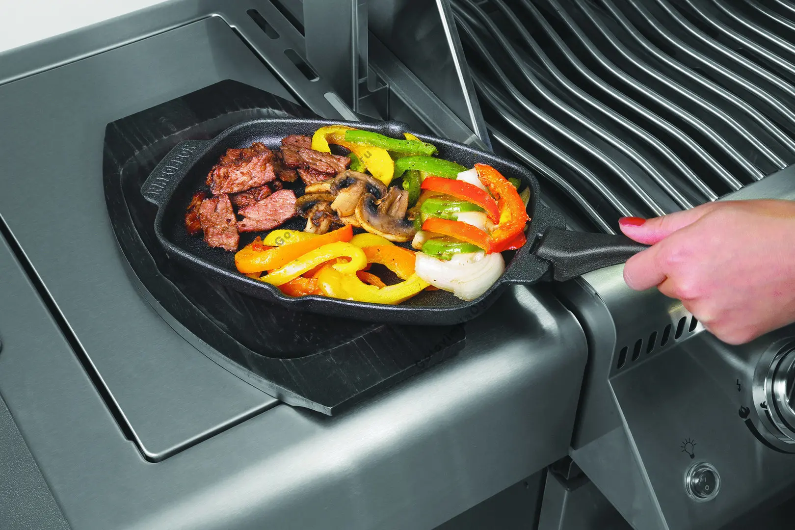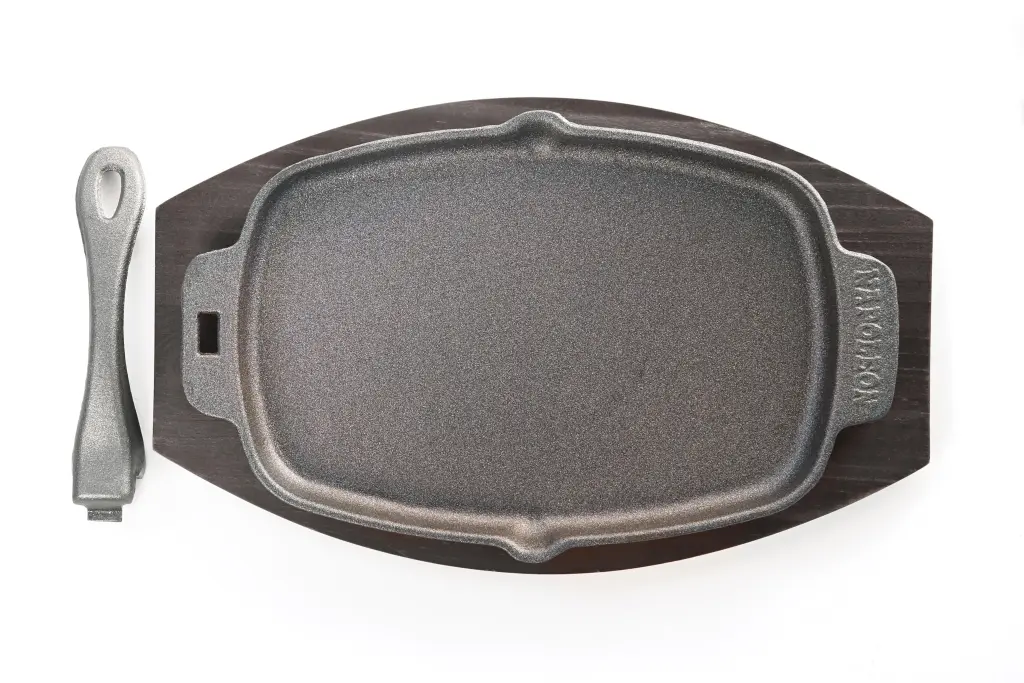 Сделана из прочного чугуна. Идеально подходит для использования на гриле, на боковой конфорке, на углях и даже в духовке или на плите. Подавайте прямо с горячего гриля к столу, используя красивый деревянный поднос. Съемная ручка остается всегда прохладной, легко снимается и одевается, так же сковороду легко мыть.