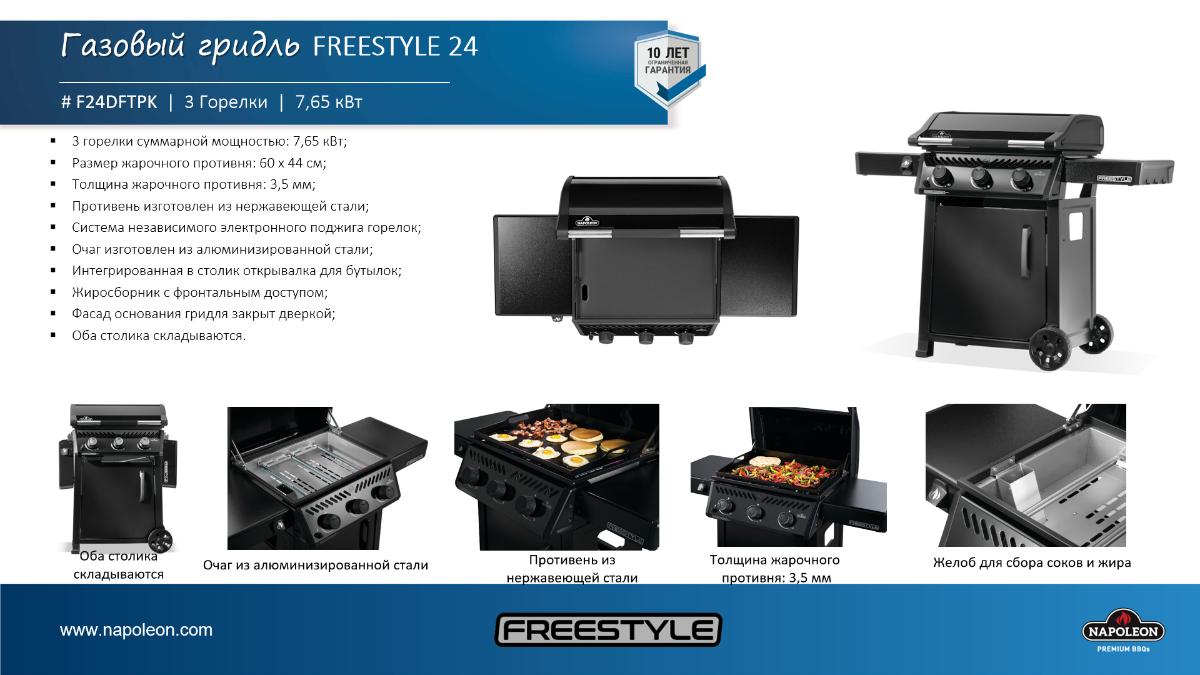 Газовый гридль NAPOLEON® FREESTYLE™ 24 это сковорода-гриль который создан для тех кто ценит универсальность, долговечность и стиль в приготовлении пищи на открытом воздухе. Благодаря нержавеющей рабочей поверхности толщиной 3,5 мм которая обеспечивает превосходное сохранение тепла и равномерное приготовление.
