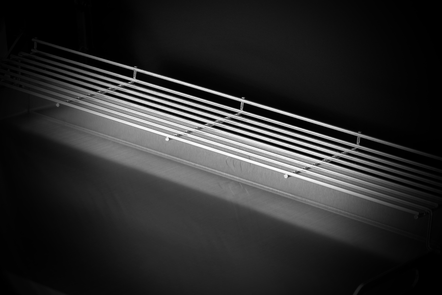 - Полка второго яруса из нержавеющей стали 67 х 14 см. Она очень удобна, когда приходится готовить сразу несколько блюд и необходимо сформировать разные температурные зоны или переложить на неё уже готовые кусочки;