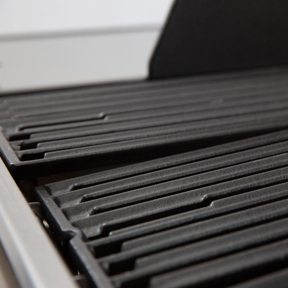 - Профессиональные массивные чугунные решетки с расстоянием между прутьями всего 6 мм. Мелко нарезанная пища не падает сквозь решетку. С одной стороны решетки заострены для нанесения фирменного рисунка на стейке, а с другой стороны имеют углубления для удержания сока и запекания курицы или нежной рыбы. Решетка может устанавливаться под углом 20-25 градусов, для стекания излишнего сока и жира;