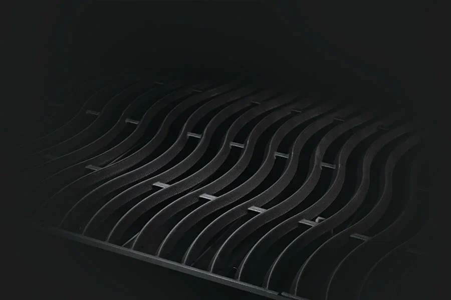 Чугунные решетки покрыты фарфоровой эмалью и имеют форму WAVE™, которая увеличивает площадь соприкосновения решетки и мяса, не дает маленьким кускам провалиться и оставляет на мясе красивый узор. Чугунная решетка отлично впитывает жар от горелок и отдает его пище, а эмалированное покрытие не дает чугуну заржаветь.