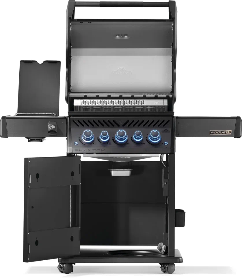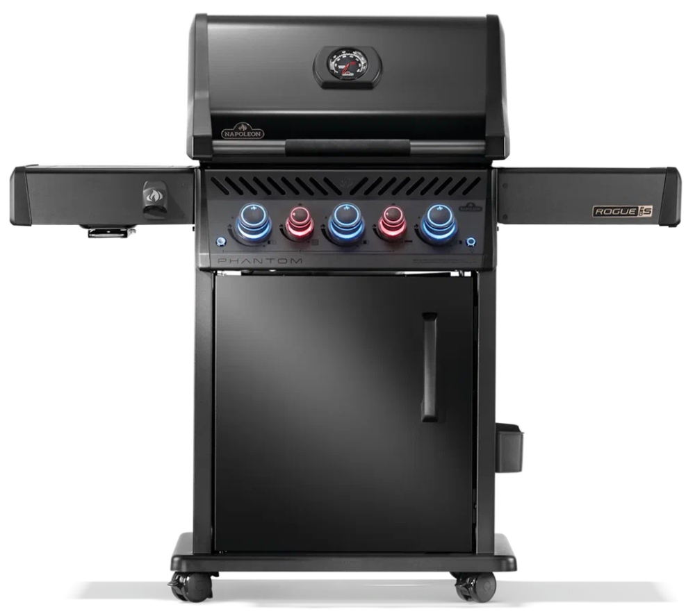 Газовый гриль NAPOLEON Rogue 425 PRO-S Phantom с тремя горелками высокой мощности под крышкой, боковой полноразмерной инфракрасной конфоркой, горелкой для вертела, в глубоком матовом чёрном цвете корпуса. Стильная подсветка ручек управления, решётка из нержавеющей стали, многофункциональная вспомогательная полка второго яруса, алюминиевая топка, премиальная топочная система, возможность готовить на угле (опция).