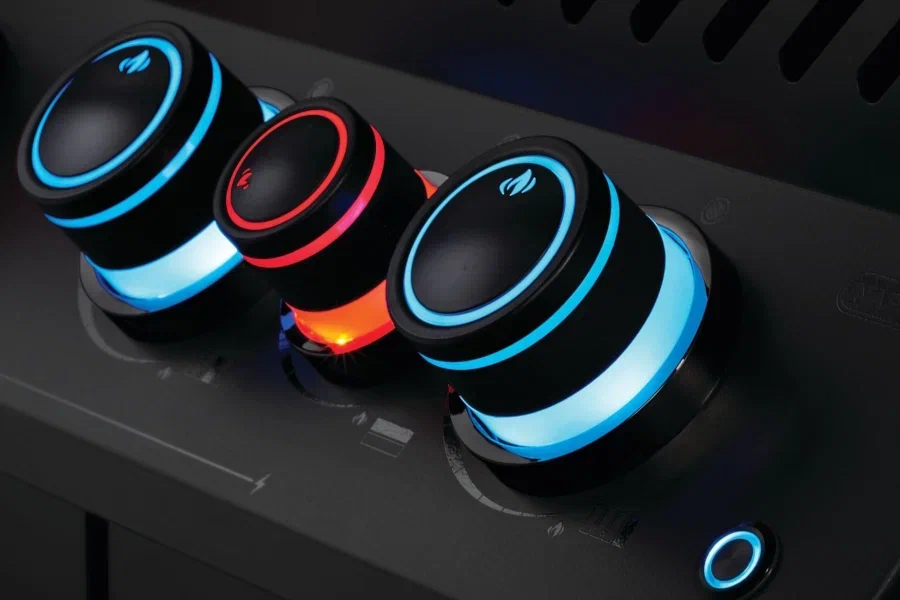 - Эргономичные ручки управления с двухцветной подсветкой для более комфортного управления грилем в темное время суток.