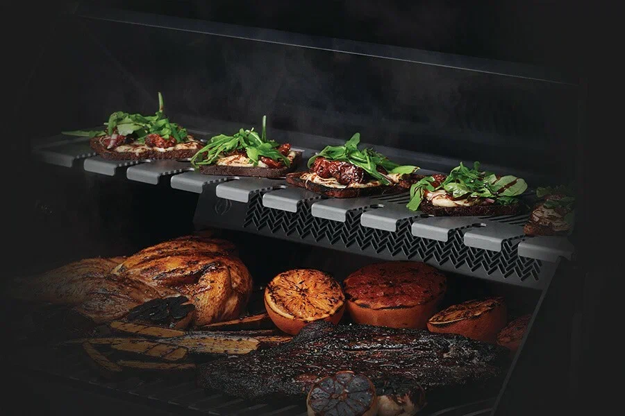- Дополнительная полноразмерная инфракрасная конфорка Sizzle Zone™ мощностью 4,5 кВт в левом пристолье гриля, разогреется до 900 °С за 30 секунд. Это очень удобно, когда Вы готовите стейки или хотите быстро обжарить продукт, не задействуя основную рабочую зону. Переместите решётку боковой конфорки в верхнее положение и готовьте при обычном температурном режиме.