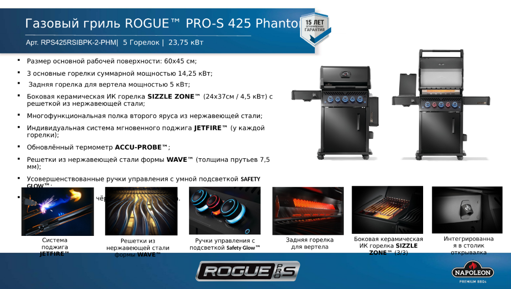 - Общая мощность гриля NAPOLEON Rogue 425 PRO-S Phantom 23,75 кВт.