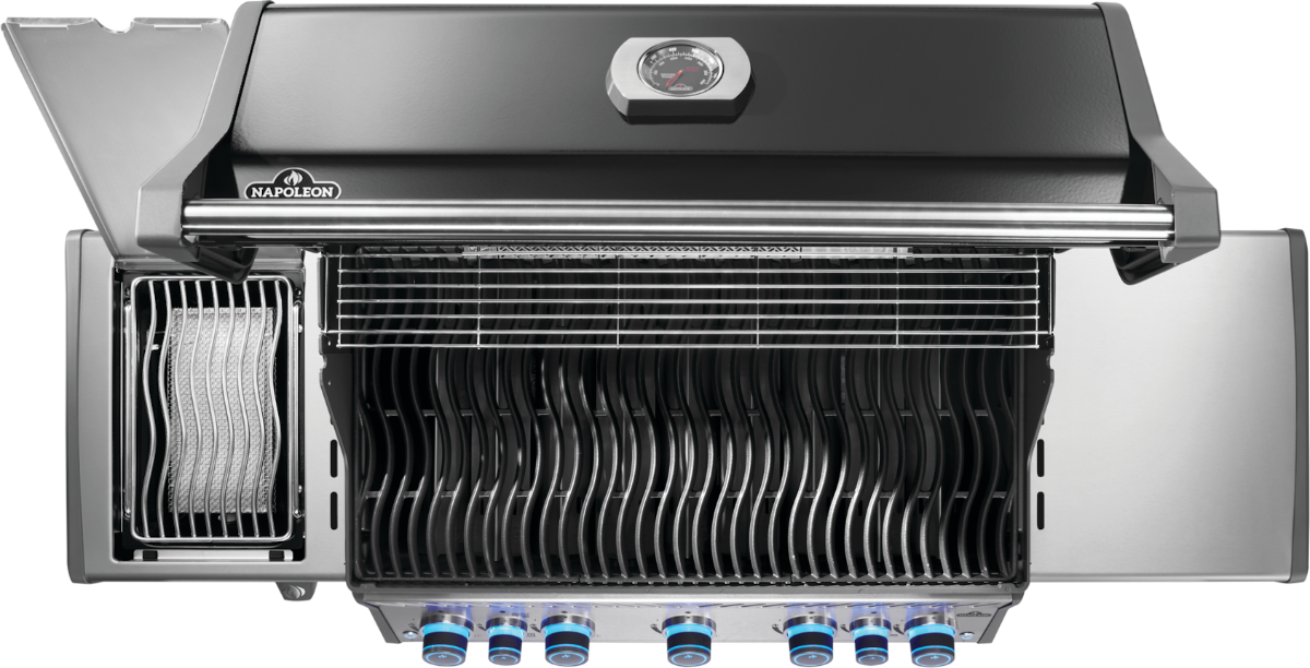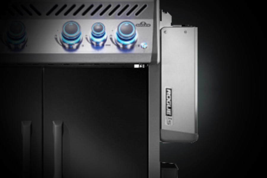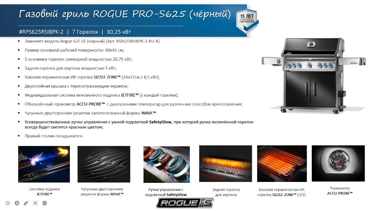 Rogue-625 PRO-S имеет 5 горелок высокой мощности под крышкой, премиальную топочную систему Napoleon, алюминиевая топка, пластины испарители выполнены из высококачественной нерж. стали AISI 304, решетки гриль из чугуна, задняя горелка, боковая инфракрасная конфорка с решеткой из нержавеющей стали AISI 304 с толщиной прутьев 7,5мм. Усовершенствованные ручки управления с умной, двухцветной подсветкой SAFETY GLOW, съемный лоток для приправ, открывашка для бутылок, возможность готовить на угле (опция).