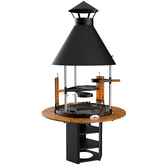 Стальная конструкция покрыта защитным слоем огнеупорной краски. Круглый очаг закрыт от непогоды цилиндрическим куполом с дымоходом. На стойках из нержавеющей стали закреплены регулируемые подставки, положение которых можно выбирать. Шашлычный модуль легко устанавливать и снимать. В комплекте предусмотрена ольховая доска для копчения. Инструменты, закуски и бокалы можно расположить на подвесных столиках, создающих единую столешницу вокруг очага.