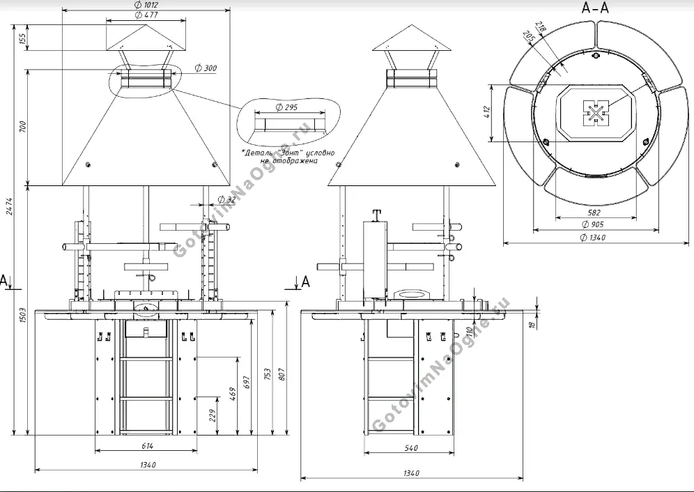 - Дымовой купол с опорными стойками и противоосадочным зонтом