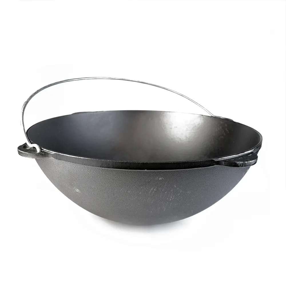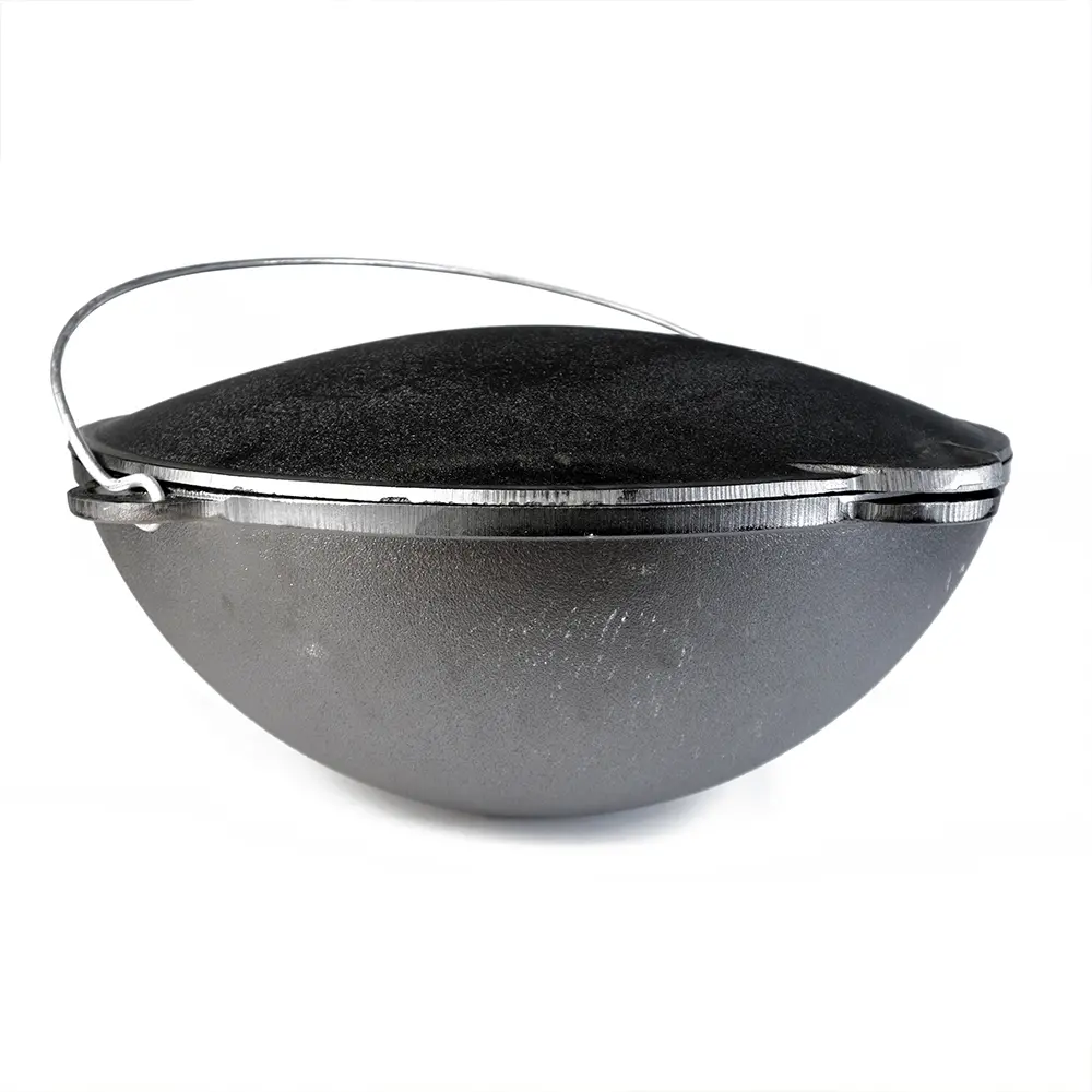 Сферическое дно казана снаружи лучше подходит для приготовлении на огне в печи, так как оно лучше для контакта пламени с плоскостью казана. Данный объем позволяет приготовить на компанию до 10 человек.