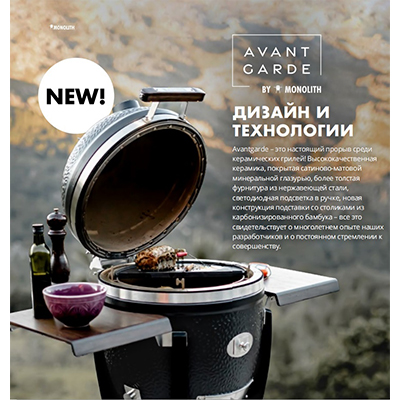 Monolith Avantgarde Сlassic – новая модель с диаметром решетки 44 см. Прекрасный выбор для гриллинга, копчения, запекания при низкой температуре, выпечки хлеба и других кулинарных экспериментов для компании до 8 человек. Avantgarde сохранил все лучшие инновации технически продвинутой серии PRO 2.0: уплотнитель из стекловолокна и нержавеющей стали, адаптер для подключения цифровых блоков управления, универсальную систему решетки для гриля Smart Grid System, а так же получил существенные преимущества, а именно: