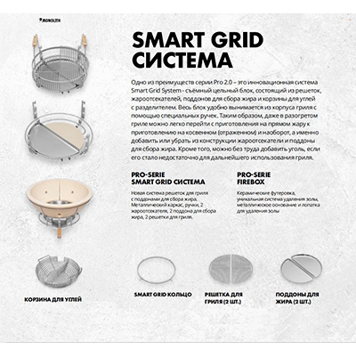 С системой решеток Smart Grid System гриль имеет непревзойденную функциональность. Система SGS позволяет располагать решетку на четырех уровнях! Отсекатель жара, решетка, и поддоны для жидкостей разделены на 2 полукруга, что позволяет комбинировать стили приготовления и одновременно создавать в гриле 2 зоны приготовления – прямой грилинг (от прямого жара углей) и косвенный грилинг (от температуры под куполом как в печи). Благодаря эксклюзивной системе подачи ароматной щепы для копчения, Вы сможете безопасно досыпать её в гриль прямо на угли, не открывая крышку гриля и не сбрасывая температуру во время готовки.