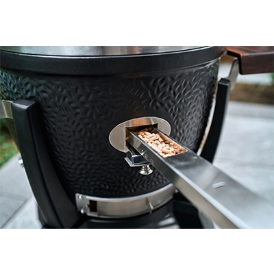 С системой решеток Smart Grid System гриль имеет непревзойденную функциональность. Система SGS позволяет располагать решетку на четырех уровнях! Отсекатель жара, решетка, и поддоны для жидкостей разделены на два полукруга, что позволяет комбинировать стили приготовления и одновременно создавать в гриле 2 зоны приготовления – прямой грилинг (от прямого жара углей) и косвенный грилинг (от температуры под куполом как в печи). Благодаря эксклюзивной системе подачи ароматной щепы для копчения, Вы сможете безопасно досыпать её в гриль прямо на угли, не открывая крышку гриля и не сбрасывая температуру во время готовки.