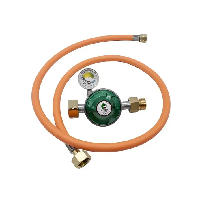 Комплект для подключения гриля с манометром (для контроля полноты баллона) DRAGONKIT. Данный комплект предназначен для газовых грилей NAPOLEON и WEBER. Позволяет Вам использовать гриль не только с туристическими, но и классическими газовыми баллонами. Данный комплект является аналогом комплекта NAPOLEON (CG-L150MRG-RU), только длина шланга 1,1 м. вместо 1,5 м. Наличие манометра для контроля полноты баллона делает новый комплект более удобным для использования. DK-500 регулятор давления для газовых баллонов с комбинированным типом соединения с вентилем (можно подключать как стальные баллоны, так и композитные баллоны с соединением СНГ и KLF). На выходе - резьба под сильфонную подводку G 1/2. Регулятор имеет клапан газ-контроль с кнопкой ручного управления и встроенный манометр. Наличие манометра даёт возможность проверить систему на герметичность от манометра до газового гриля. Клапан газ-контроль срабатывает при избыточном расходе газа (более 100% от максимальной пропускной способности регулятора). Такой расход происходит при повреждении или обрыва шланга. Клапан перекрывает подачу газа на 100%, тем самым прекращает дальнейшую утечку газа и устраняет риски возникновения аварийной ситуации.