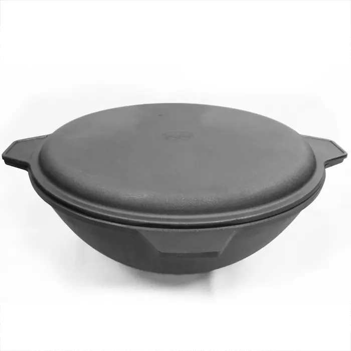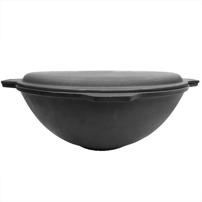 Толстые стенки казана позволяют равномерно нагреваться продуктам, делая их вкус и аромат особенно насыщенными. Крышка идеально прилегает к казану, препятствуя неконтролируемому пароотделению. Приобретая казан с крышкой-сковородкой, Вы получаете сразу 2 кулинарных инструмента! Толстая чугунная крышка-сковородка позволяет легко жарить и пассировать продукты в процессе приготовления сложных блюд. А разместив её на печи под казан, Вы сможете готовить как на большой жаровне.
