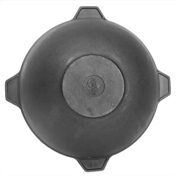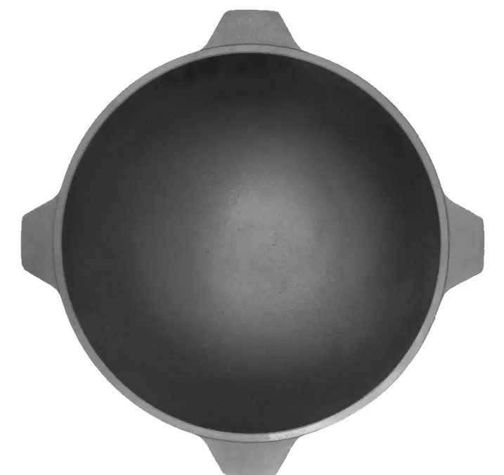 Внутренняя поверхность чугунного казана имеет сферическую, классическую округлую форму, а внешняя сторона казана плоская, что позволяет ему быть устойчивым на любой поверхности, диаметр плоского дна 12 см. Такая форма чугунного казана делает его пригодным для любых условий. Внутренняя поверхность казана абсолютно гладкая без шероховатостей и каверн.