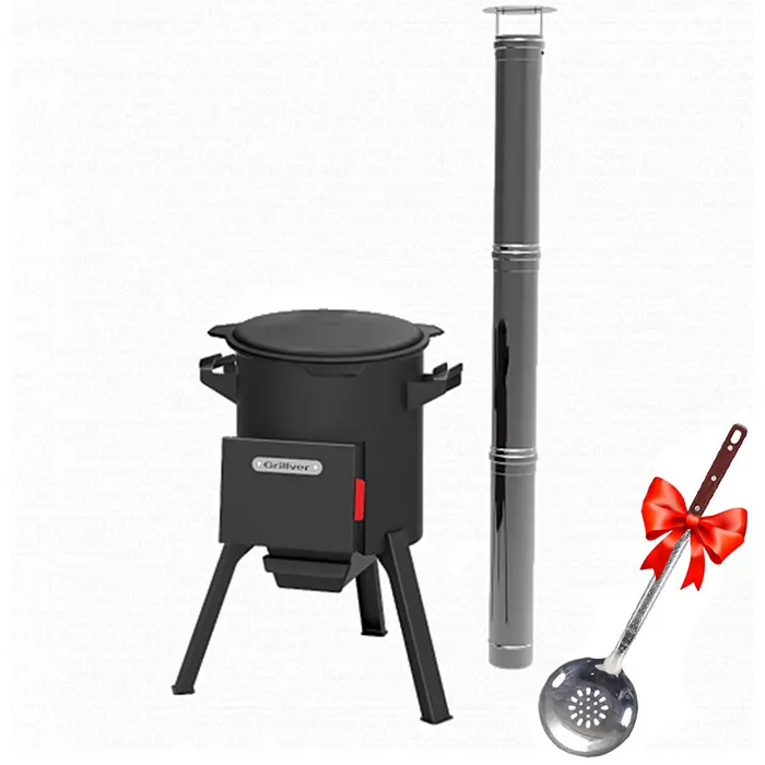 Комплект включает в себя печь "Берель-400К NEW" с дымоходом из нержавеющей стали и казан белорусский 12 л. с крышкой-сковородкой. Очень высокое качество казана и крышки, которая идеально прилегает к казану. Данные казаны соответствуют ГОСТ Р 52116-2003 по чугунной посуде. Печь отводит дым через дымоход, имеет удобную высоту и надежную конструкцию.