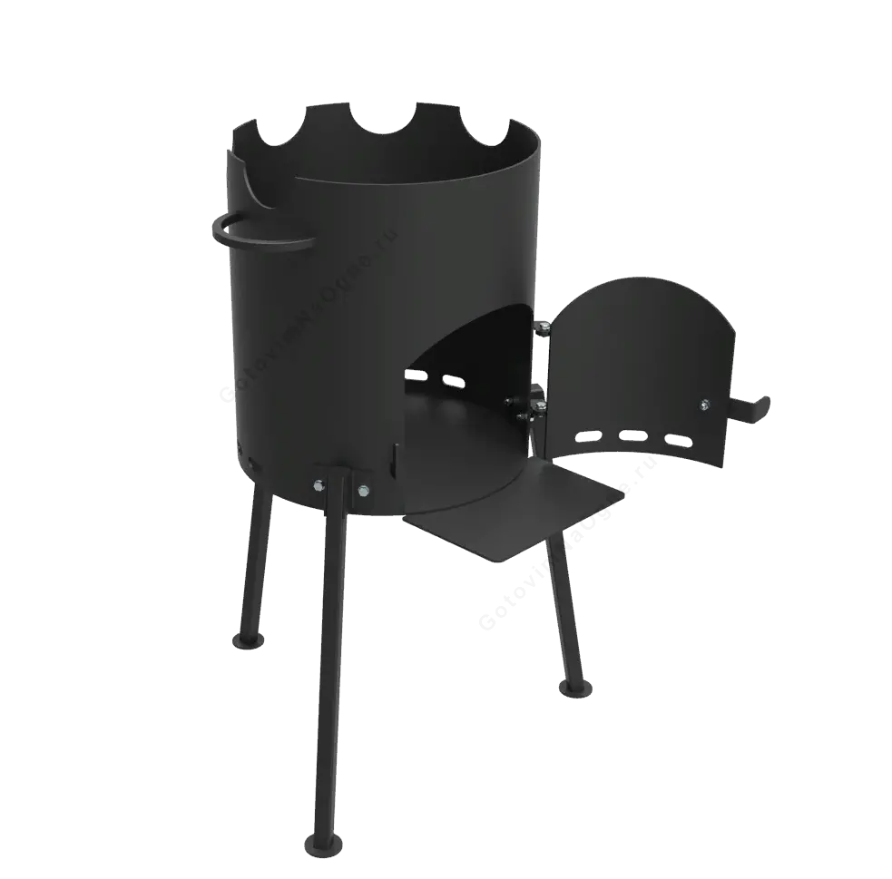 - Разборные ножки имеют плоское монтажное основание. Печь с казаном на 3 точках опоры будут ровно стоять на земле и не углубляться.