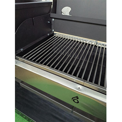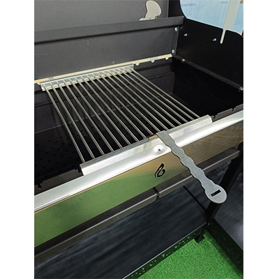 - Две отдельные решетки из нержавеющей стали имеют толстые прутья. Позволяют, не убирая продукт с решётки, добавить контейнер с щепой. Одновременно можно пользоваться шампурами и одной решеткой. Решетки можно мыть в посудомоечной машине и подвешивать на крючки при использовании шампуров.