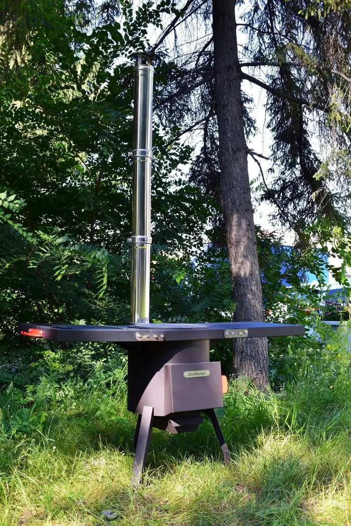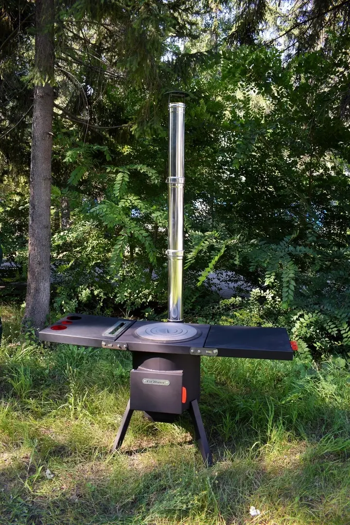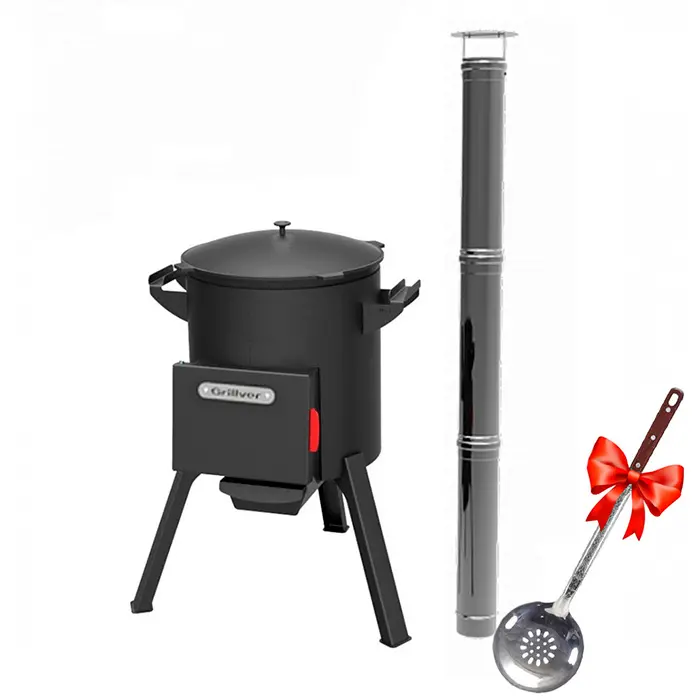 - Возможность установки дополнительных опций: держатель для крышки казана, плита с чугунными конфорками, фланец-переходник для казана 8 литров, решетка гриль.