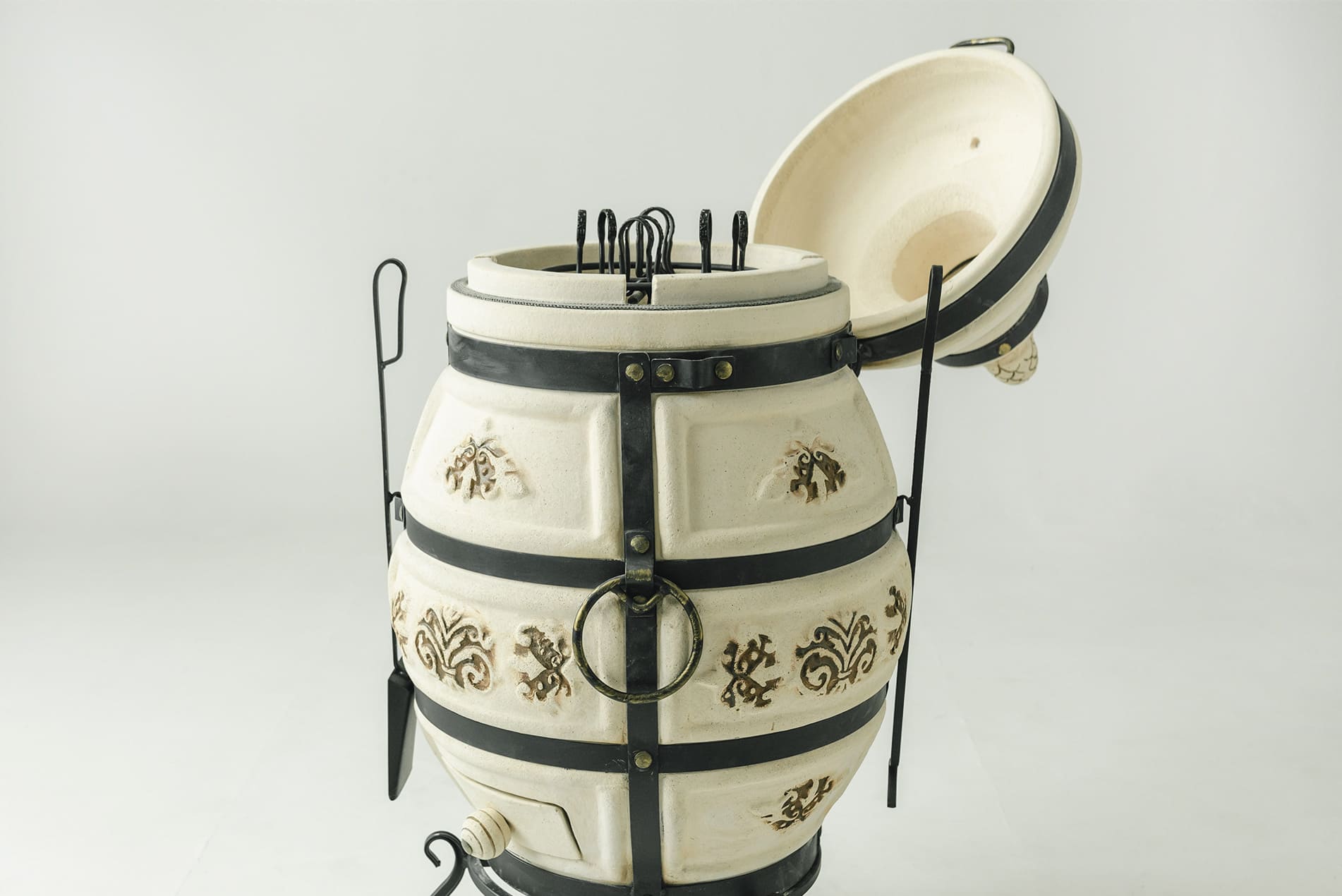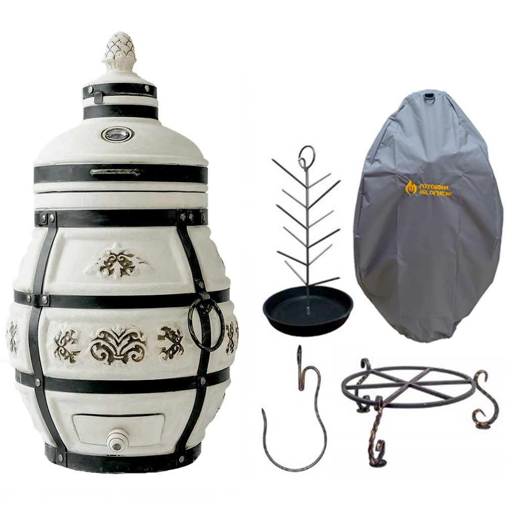 Модель «Александр 2026 NEW» выглядит достойно и привлекательно. Тандыр – это ручная работа! Оригинальный орнамент, который благодаря технологии нанесения, не потеряет цвет с годами. Помимо шампуров, держателя шампуров и колосника на дне тандыра в комплект поставки входят кочерга и совок. С помощью крючков они удобно подвешиваются на тандыр. Также, усовершенствованная модель имеет штатные места для установки боковых столиков.