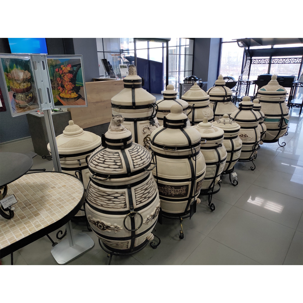 Новая модель «Барс» 2023г. из сегмента больших тандыров более 100 кг. с широкой горловиной. 10 шампуров. Вес 142 кг., толщина стенки 7 см. Широкая горловина 29 см. подходит для больших аксессуаров, кроме большой этажерки.