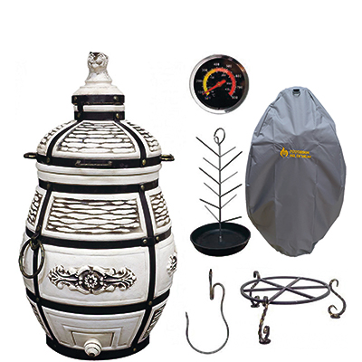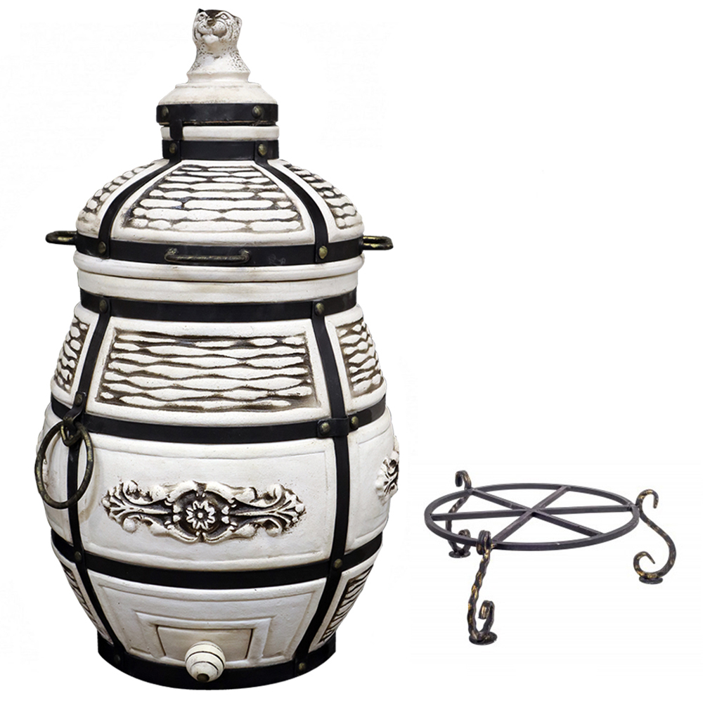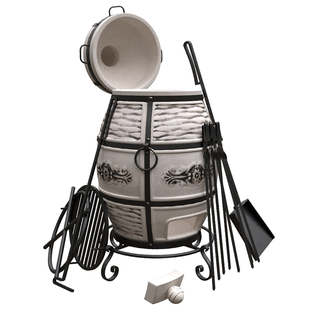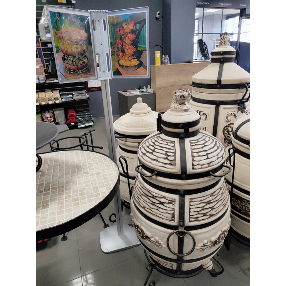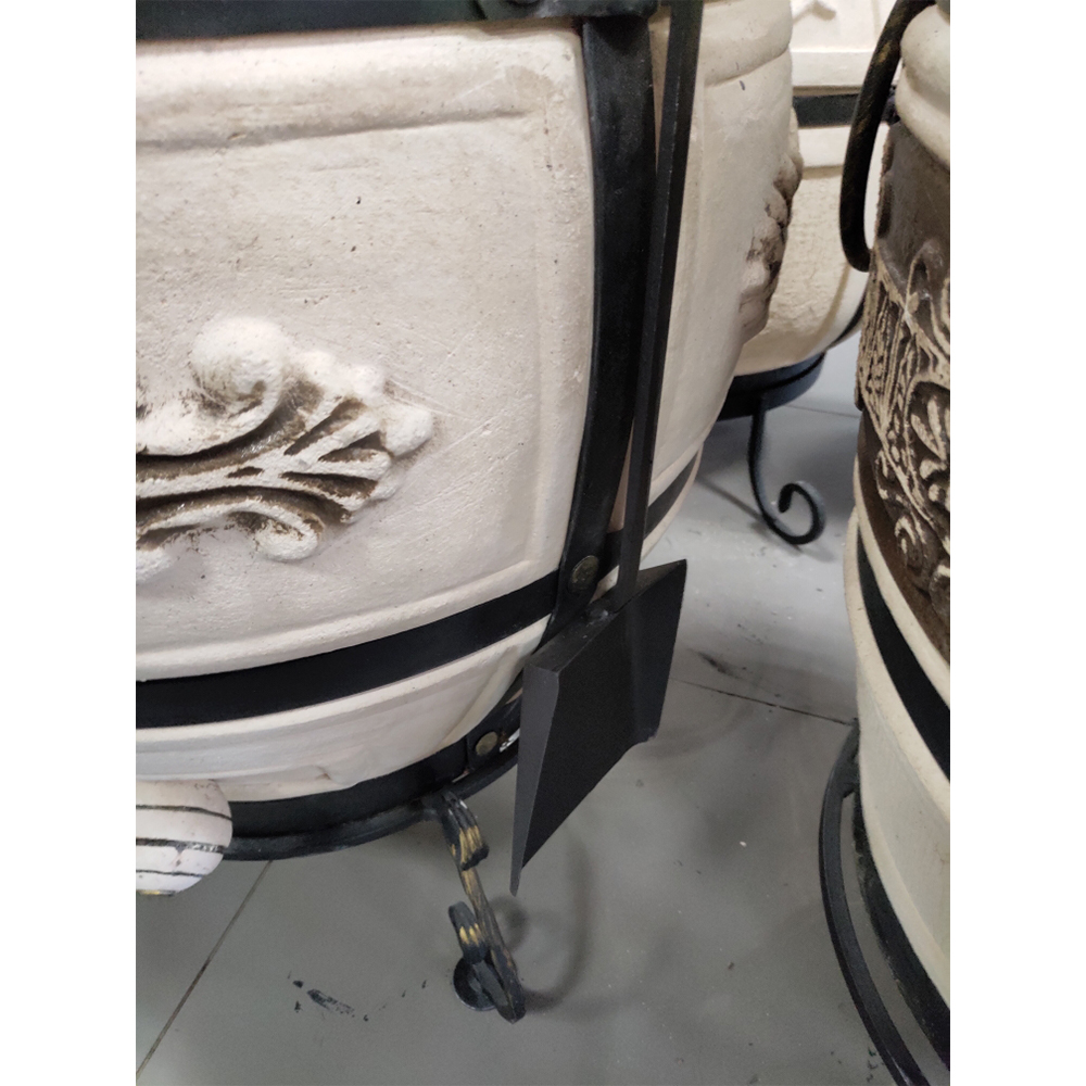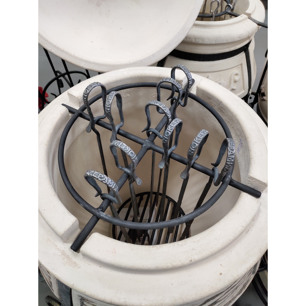 Модель «Барс» выглядит достойно и привлекательно. Тандыр – это ручная работа! Оригинальный орнамент, который благодаря технологии нанесения, не потеряет цвет с годами. Помимо шампуров, держателя шампуров и колосника на дне тандыра, в комплект поставки входят кочерга и совок. С помощью крючков они удобно подвешиваются на тандыр.
