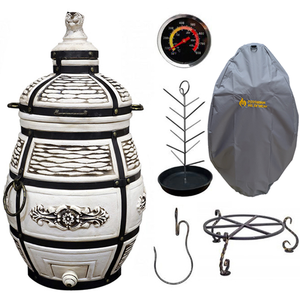 Тандыр (в т.ч. кочерга, совок, колосник, 10 шампуров, приспособление для подвешивания шампуров), подставка под тандыр, крюк, средняя чугунная "Сковородка ёлочка", термометр, чехол