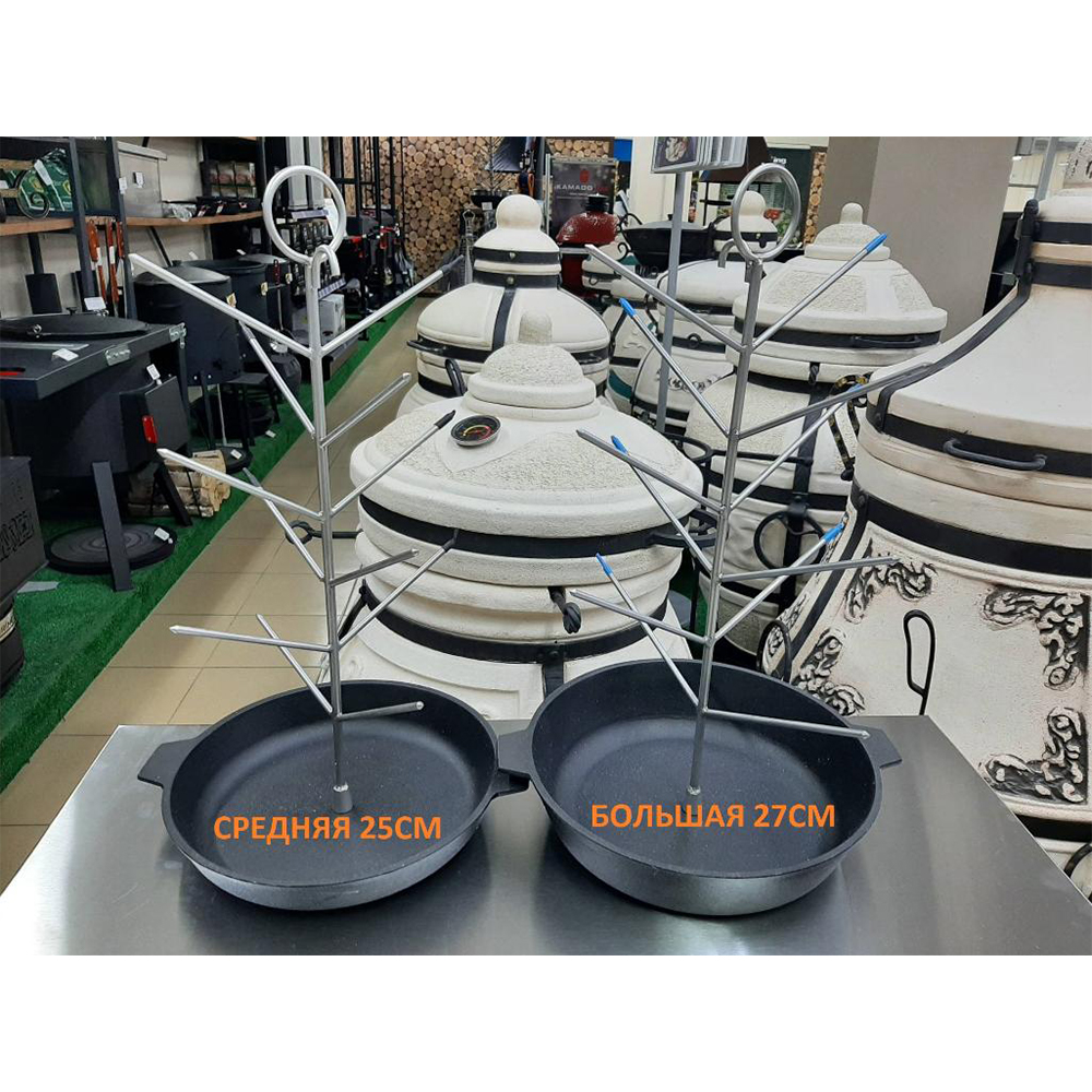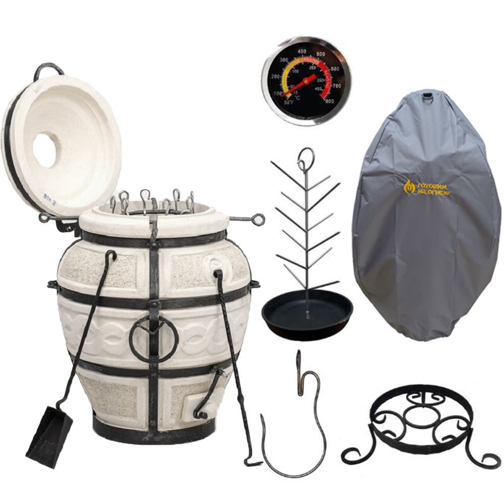 Тандыр (в т.ч. кочерга, совок, колосник, 8 шампуров, приспособление для подвешивания шампуров), подставка, крюк. средняя чугунная сковородка "ёлочка", термометр, чехол
