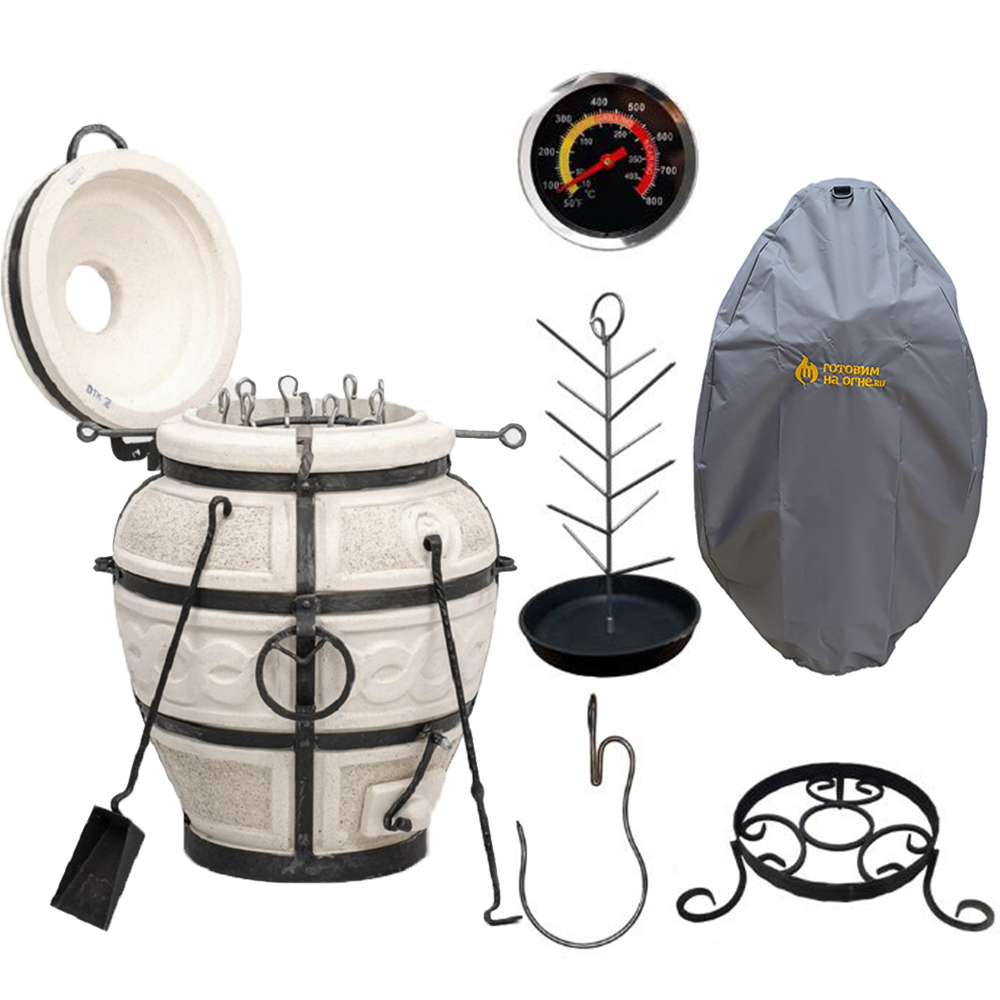 Тандыр (в комплекте с кочергой, совком, колосником, 8 шампурами, приспособлением для подвешивания шампуров), подставка, крюк, средняя чугунная сковородка "ёлочка", термометр, чехол.