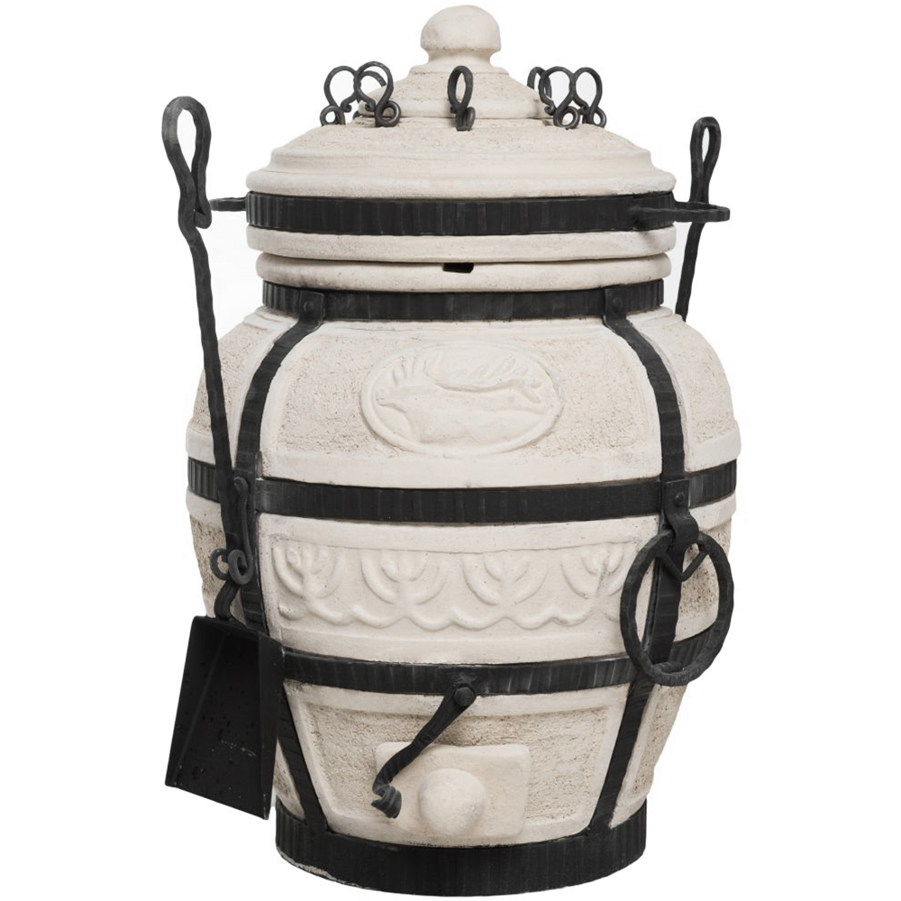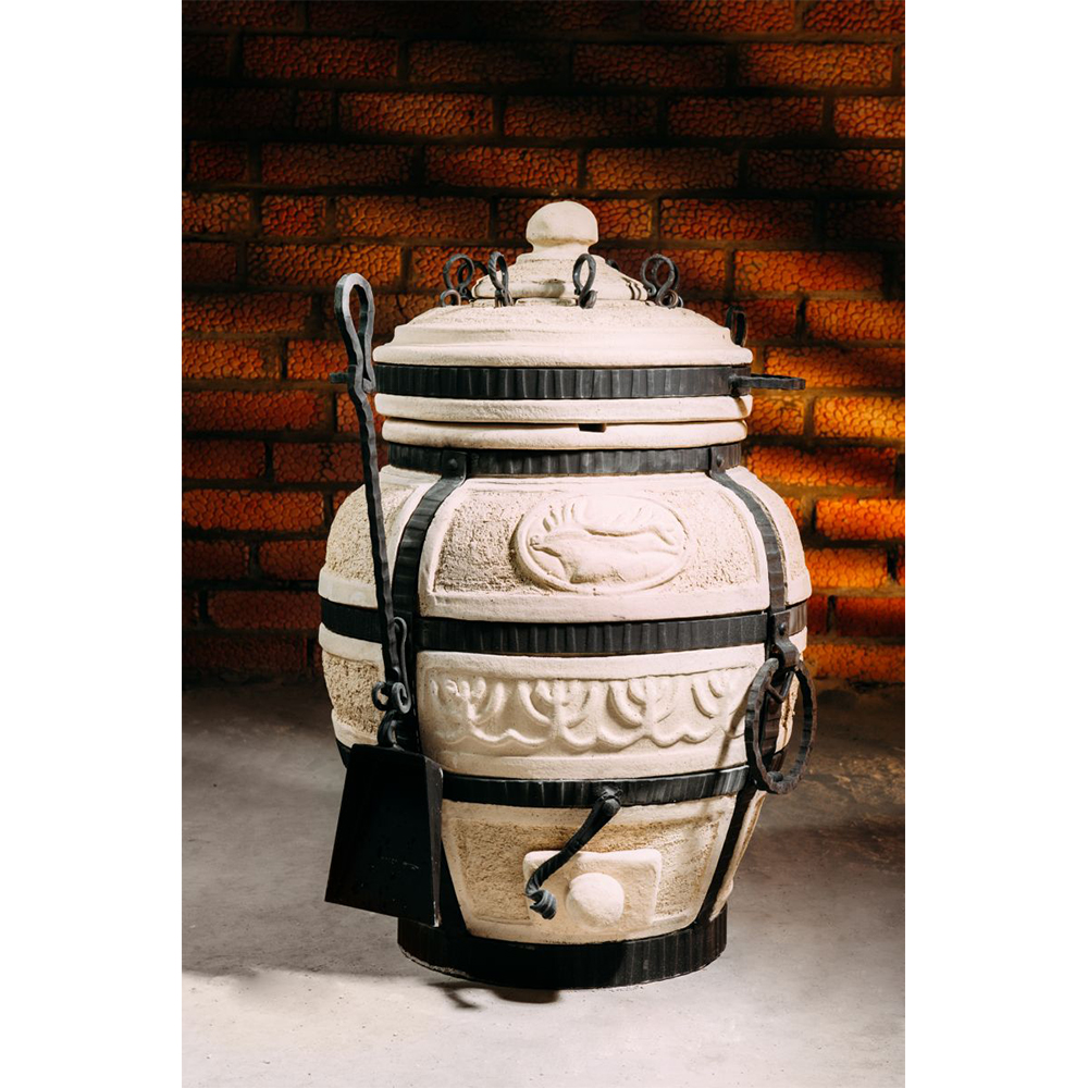 Керамический тандыр выполнен в бежевом цвете. Изготовленный из шамотной глины высокотемпературного обжига, он обладает высокой теплоемкостью, экологичностью, прочностью и долговечностью (срок службы более 10 лет).