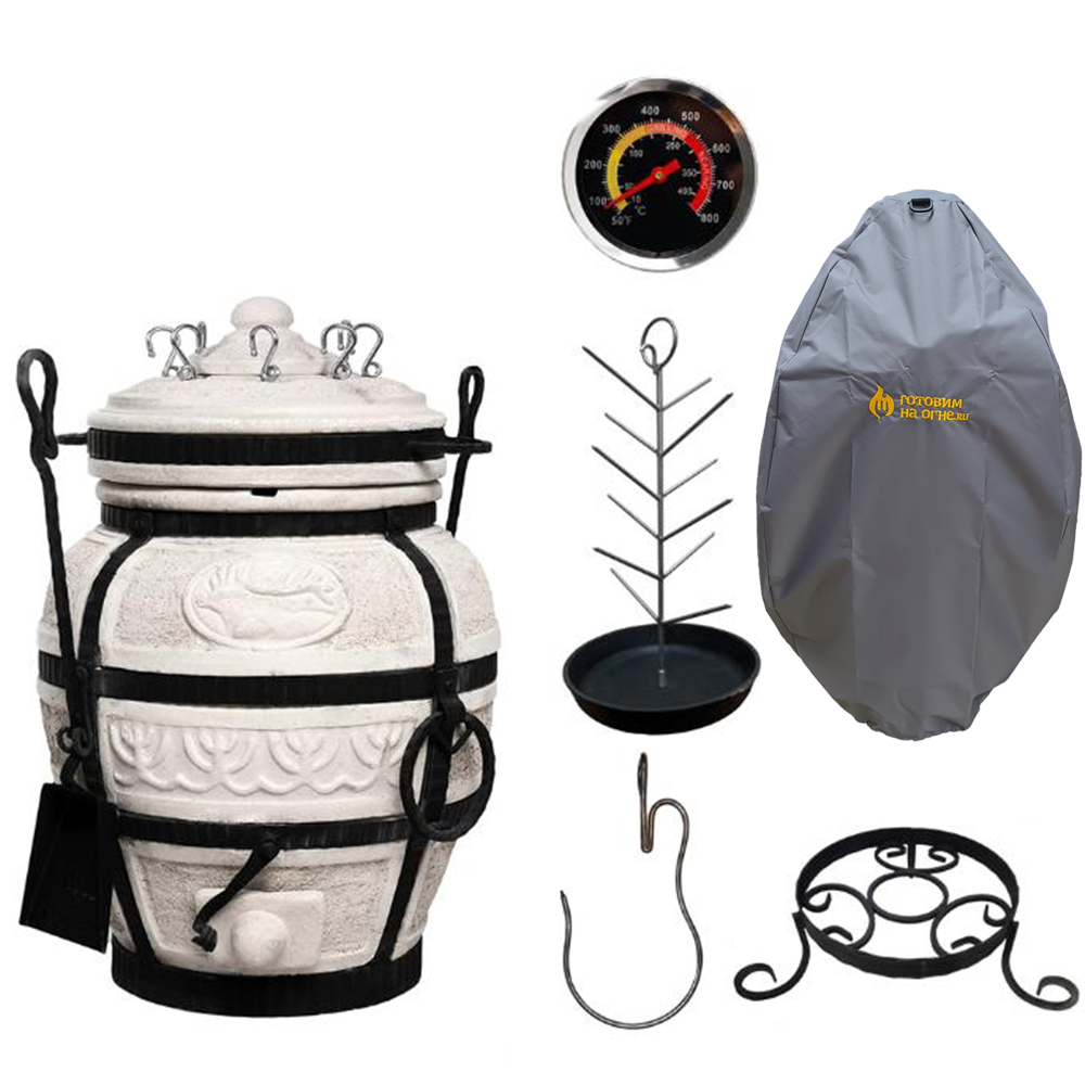 Тандыр (в т.ч. кочерга, совок, колосник, 8 шампуров), подставка, крюк, чугунная "сковородка ёлочка", термометр, чехол