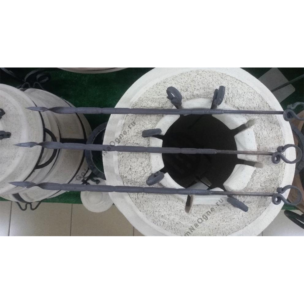 Очень популярная модель из сегмента средних тандыров. 8 шампуров. Вес 80 кг., толщина стенки 5 см. Горловина стандартного типа диаметром 24 см. для средних аксессуаров.