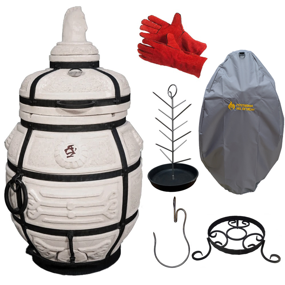 Тандыр (в т.ч. кочерга, совок, колосник, 10 шампуров, приспособление для подвешивания шампуров), подставка под тандыр, чехол, чугунная "Сковородка ёлочка", термометр, крюк