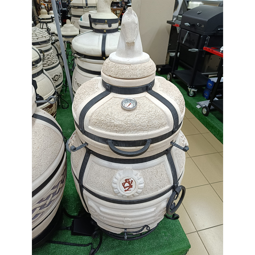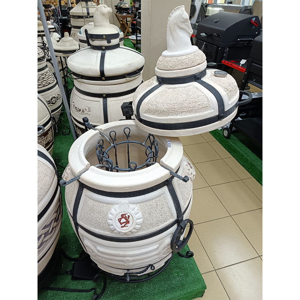 Самая доступна модель на рынке из сегмента больших тандыров более 130 кг. с широкой горловиной. 10 шампуров. Вес 133 кг., толщина стенки 6,5 см. Широкая горловина 33 см. для больших аксессуаров