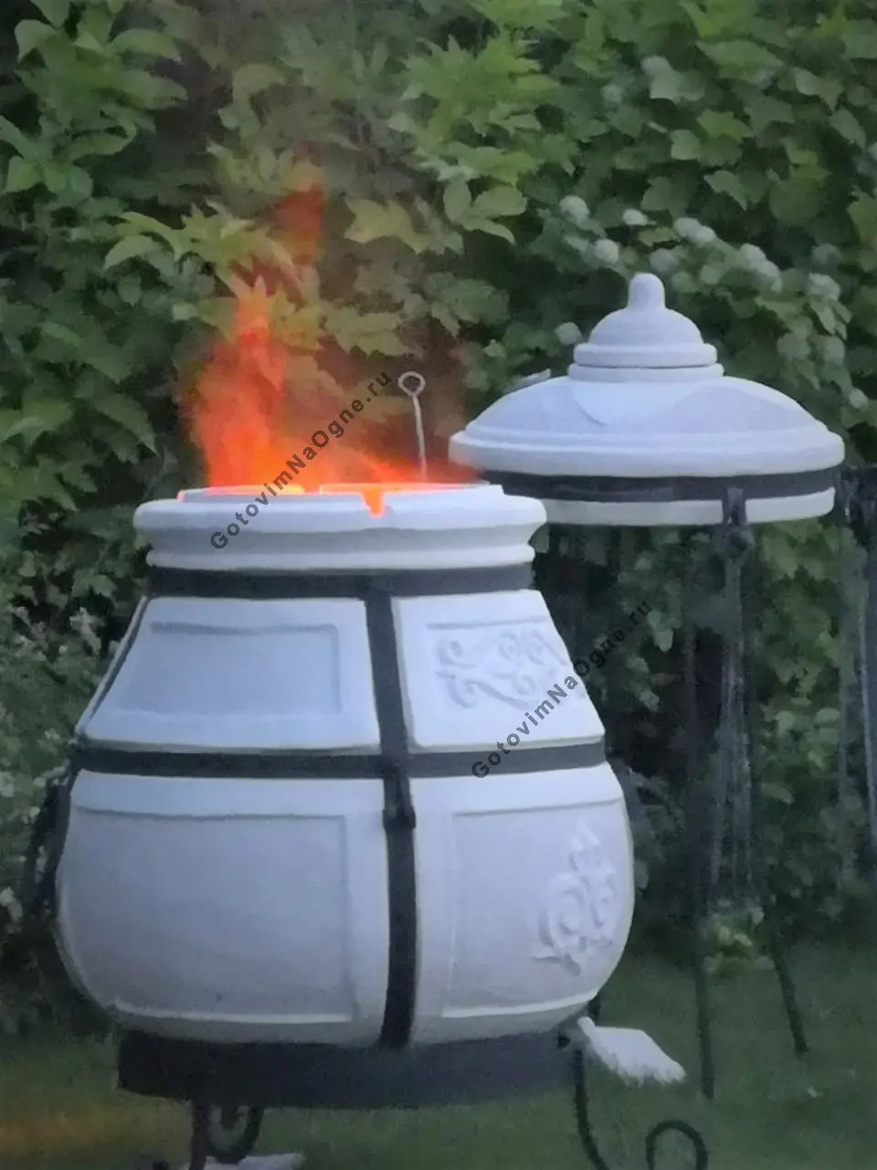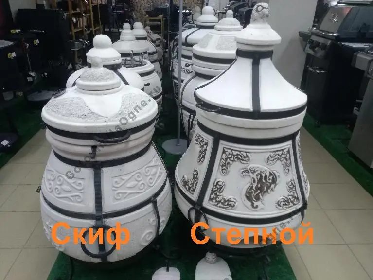 Тандыр "Скиф" имеет вес 135 кг., 12 кованых шампуров из нерж. стали с закрученными концами, толщина стенки 5,5 см. Большой диаметр горловины - 31 см.