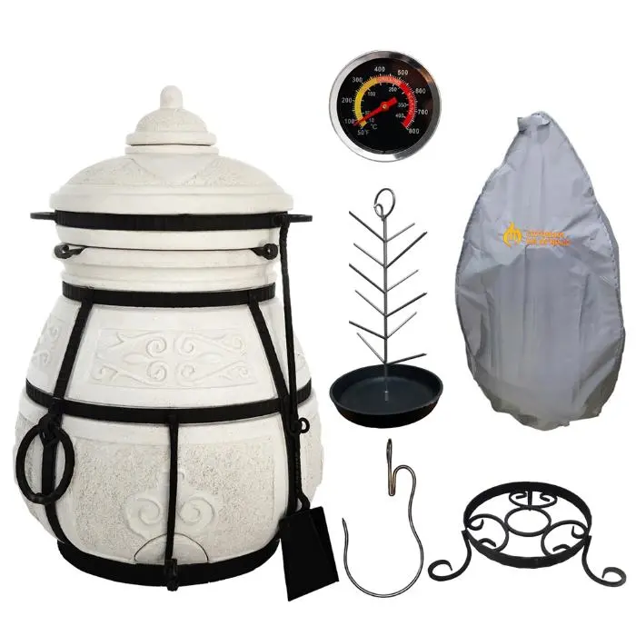 Тандыр (в т.ч. кочерга, совок, чуг. колосник, 12 шампуров, приспособление для подвешивания шампуров), подставка под тандыр, крюк, чугунная "сковородка ёлочка", термометр, чехол
