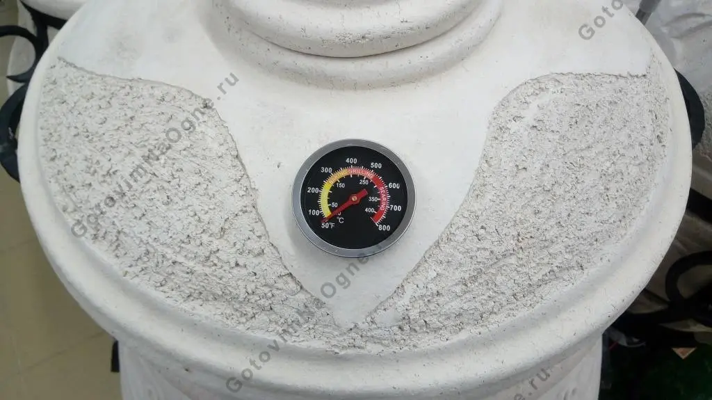 Отличный помощник для приготовления сочных блюд в тандыре. Как показала практика, при приготовлении барбекю методом запекания термометр крайне необходим, поэтому все грили и печи оснащаются термометрами. Термометр дает возможность контролировать температуру внутри тандыра и дает понимание, при какой температуре происходит процесс готовки. Он поможет понять в каком режиме находится тандыр, можно ли сделать в тандыре вторую закладку пищи.