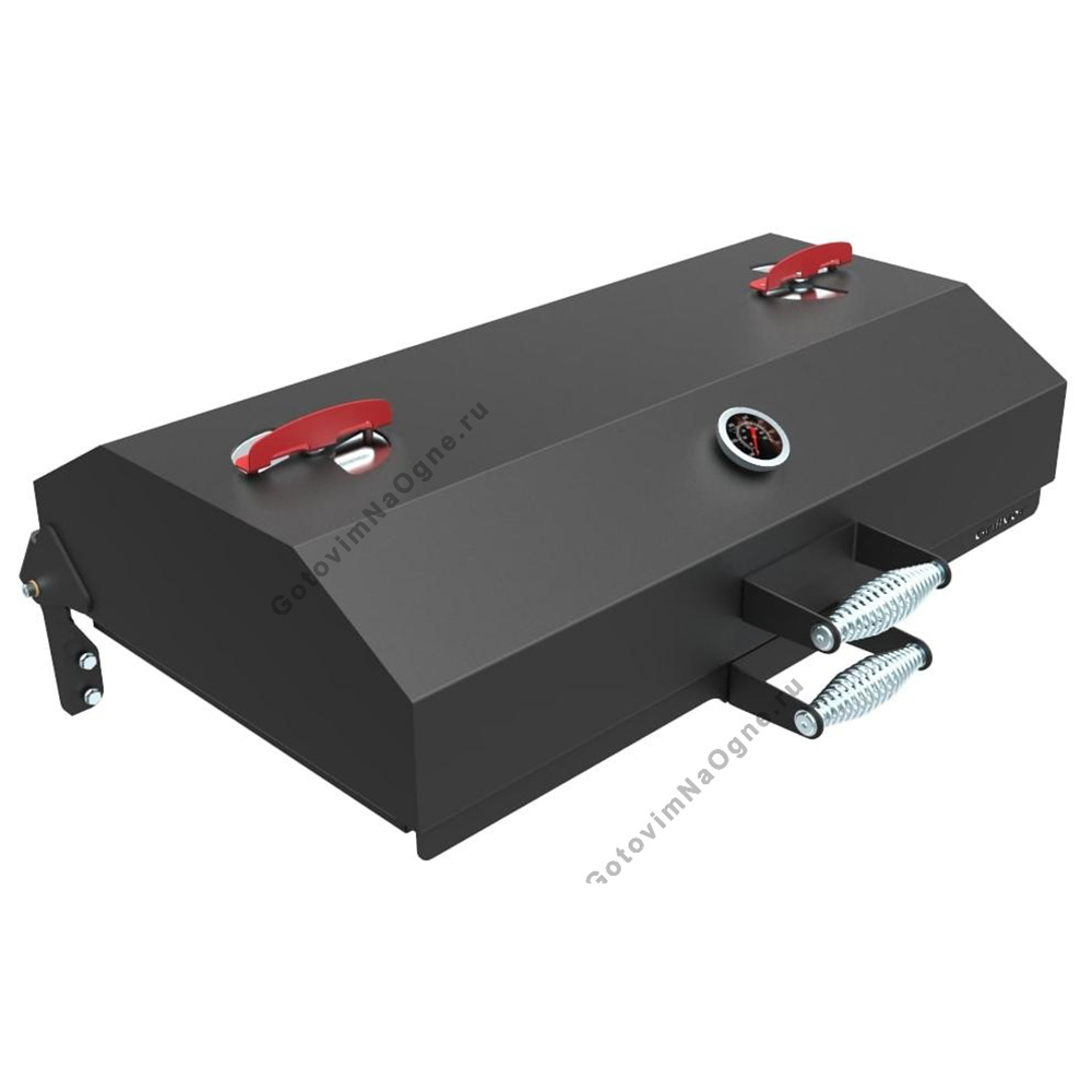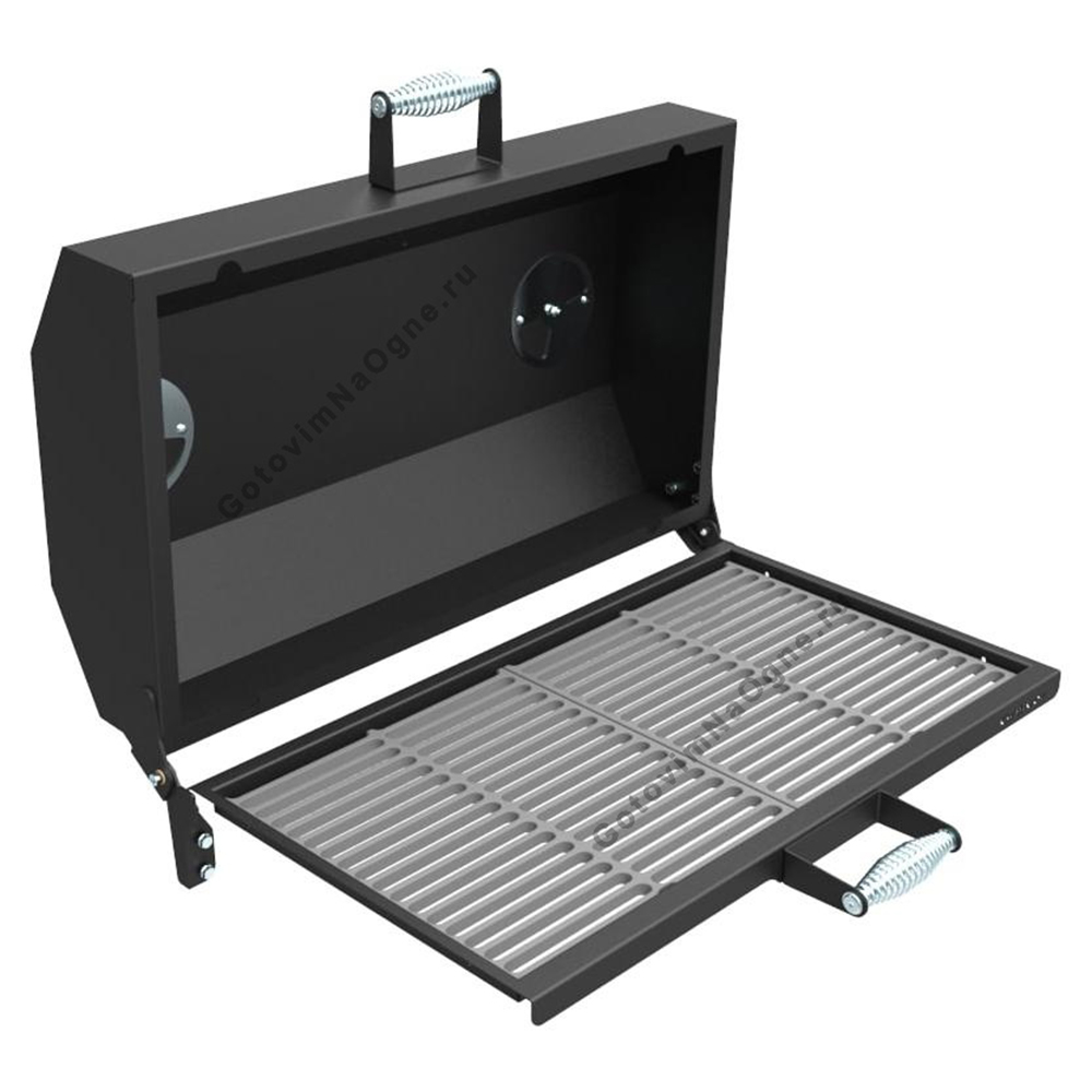 Крышка откидная, на шарнирах, с рукояткой, с ограничителем хода крышки, с вентиляционными заслонками и термометром, с чугунной решеткой, для печи-мангала "Искандер 360".