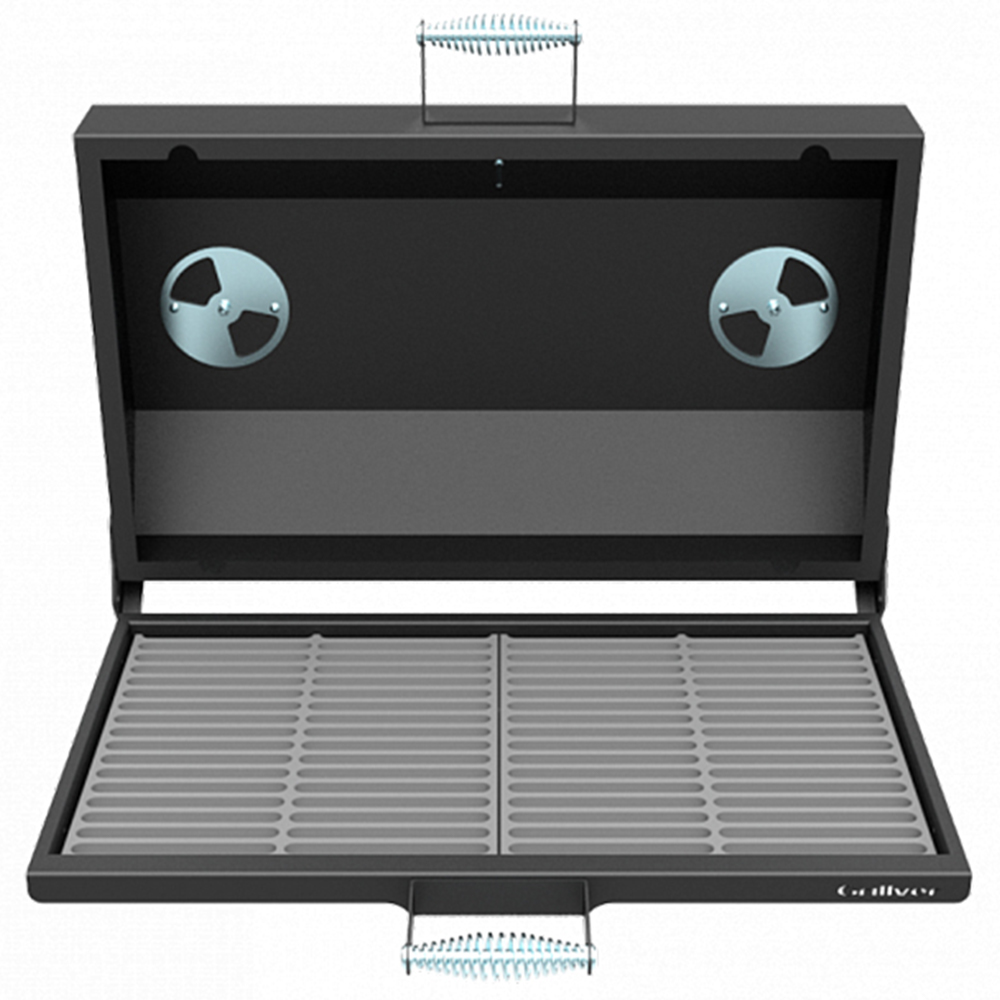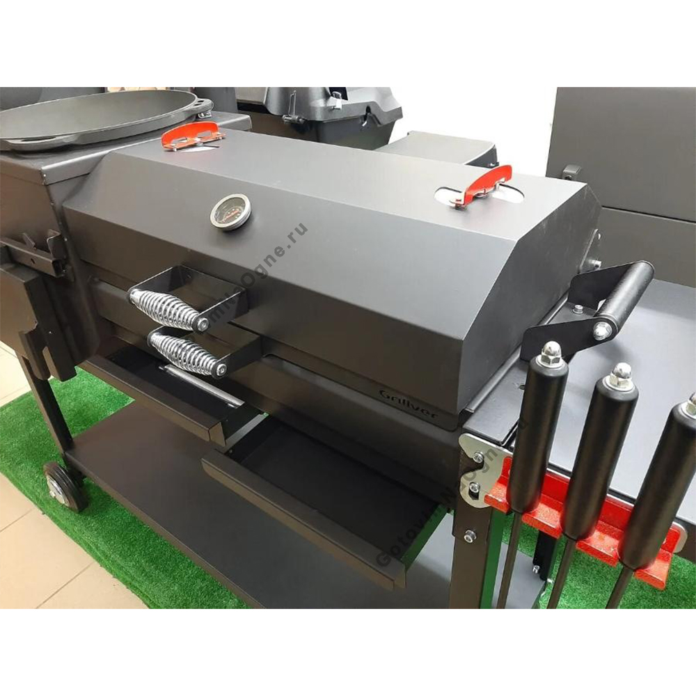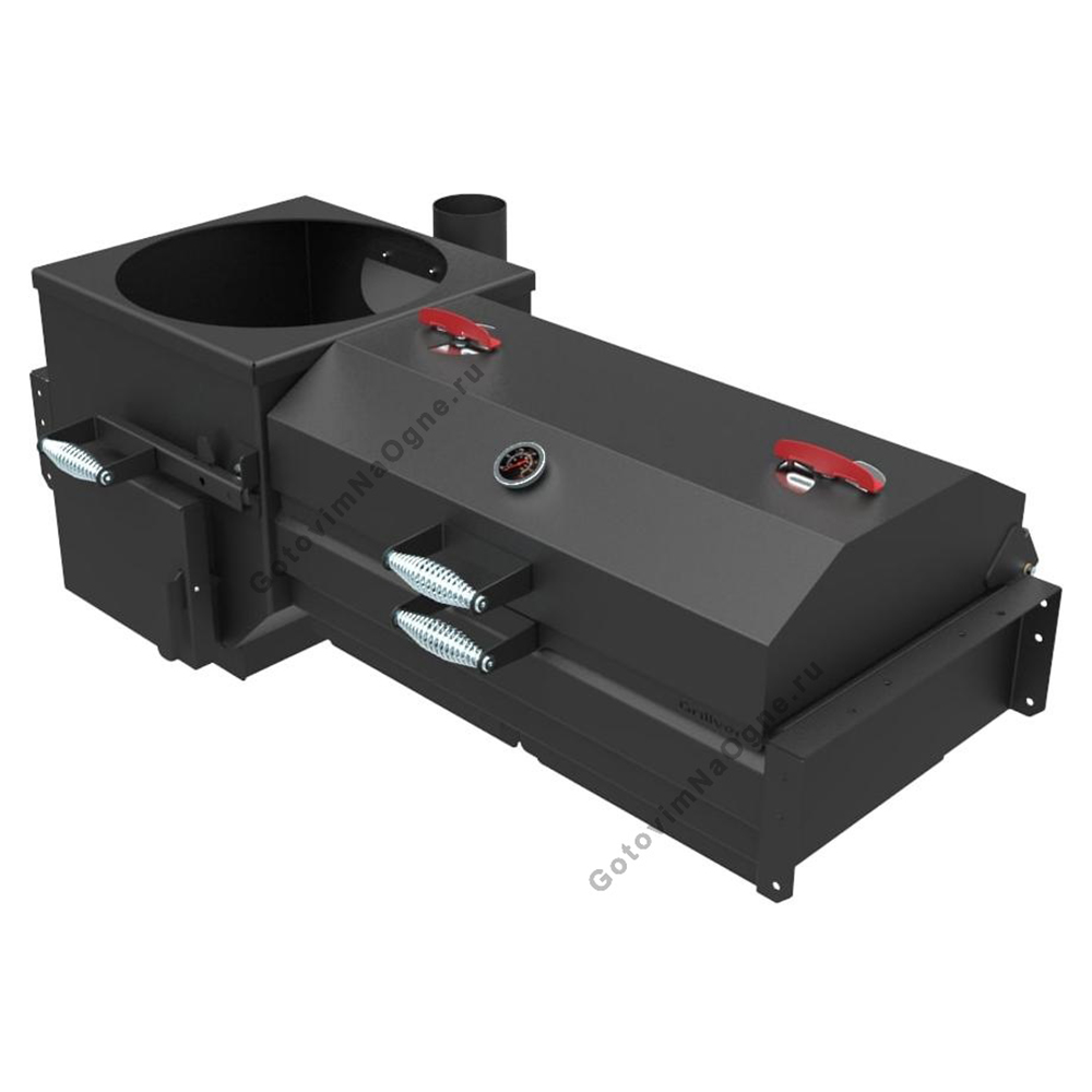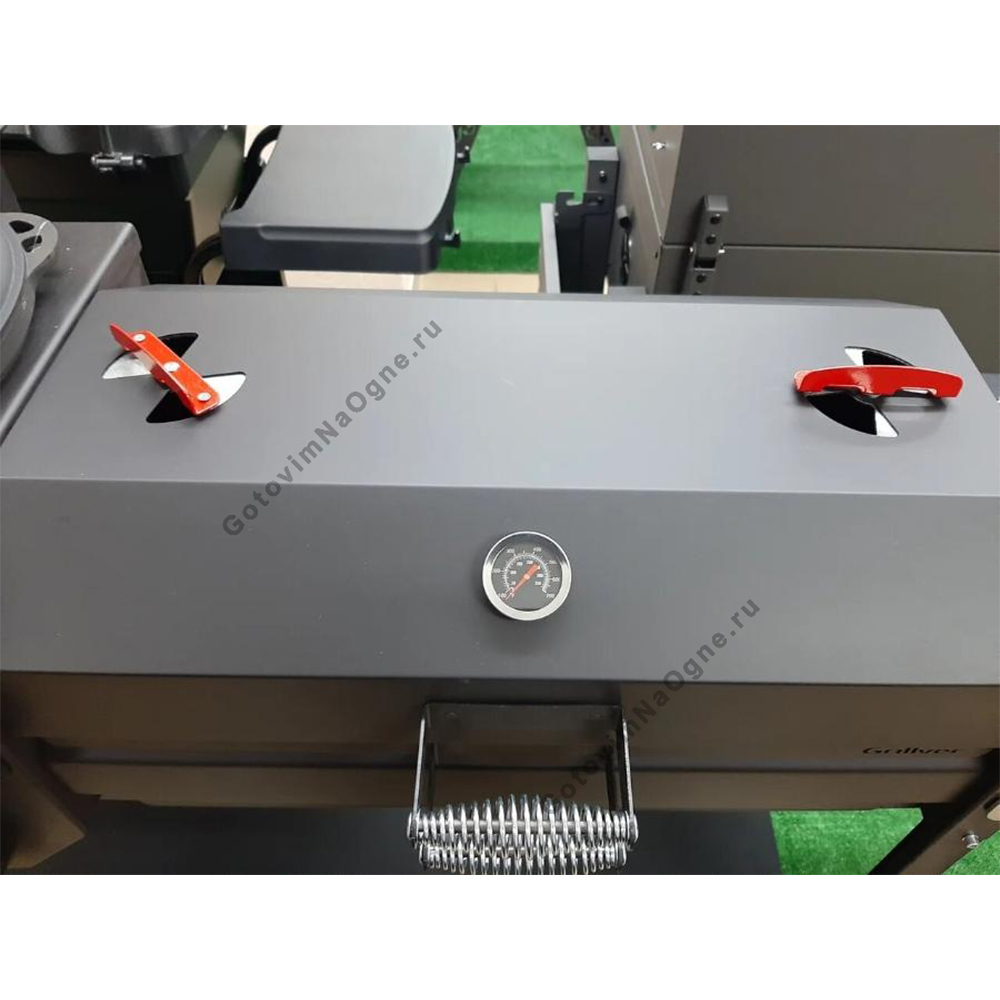 Интенсивность горения углей и температура под крышкой регулируется открытием-закрытием зольных ящиков, а также открытием-закрытием вентиляционных заслонок на крышке. Наличие термометра позволяет контролировать жар под крышкой, а наличие вентиляционных заслонок в боковых стенках крышки позволяет его регулировать.