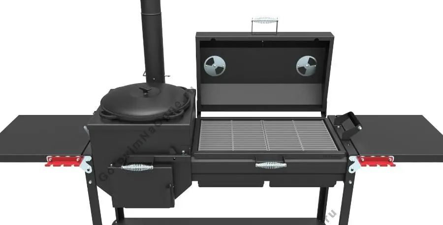 Решётка-гриль быстросъёмная, благодаря чему решётку можно снять и можно жарить шашлык на мангале, как обычно.