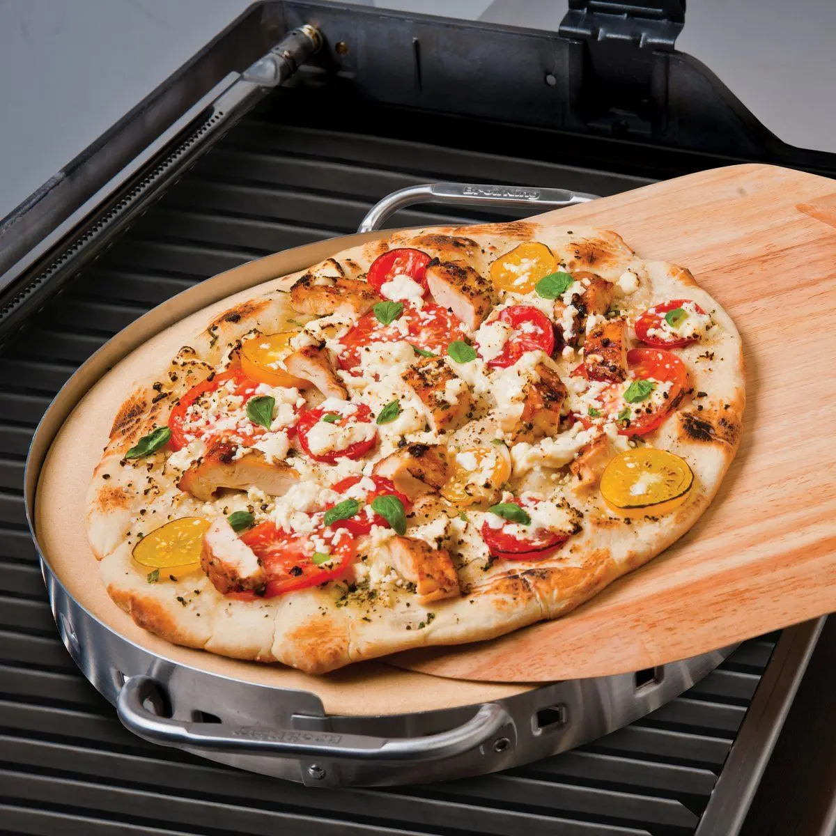 Камень для пиццы Broil King® Imperial™ имеет высококачественный поддон толщиной 1.2 мм. с большими ручками (10 мм.) из нержавеющей стали. Набор включает в себя прочный камень для пиццы диаметром 33 см, способный вытерпеть резкие перепады температуры, высококачественный поддон из нержавеющей стали и деревянную лопатку для пиццы. Поддон также не даст пицце съехать в огонь, когда Вы достаете ее лопаткой.