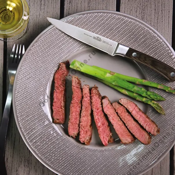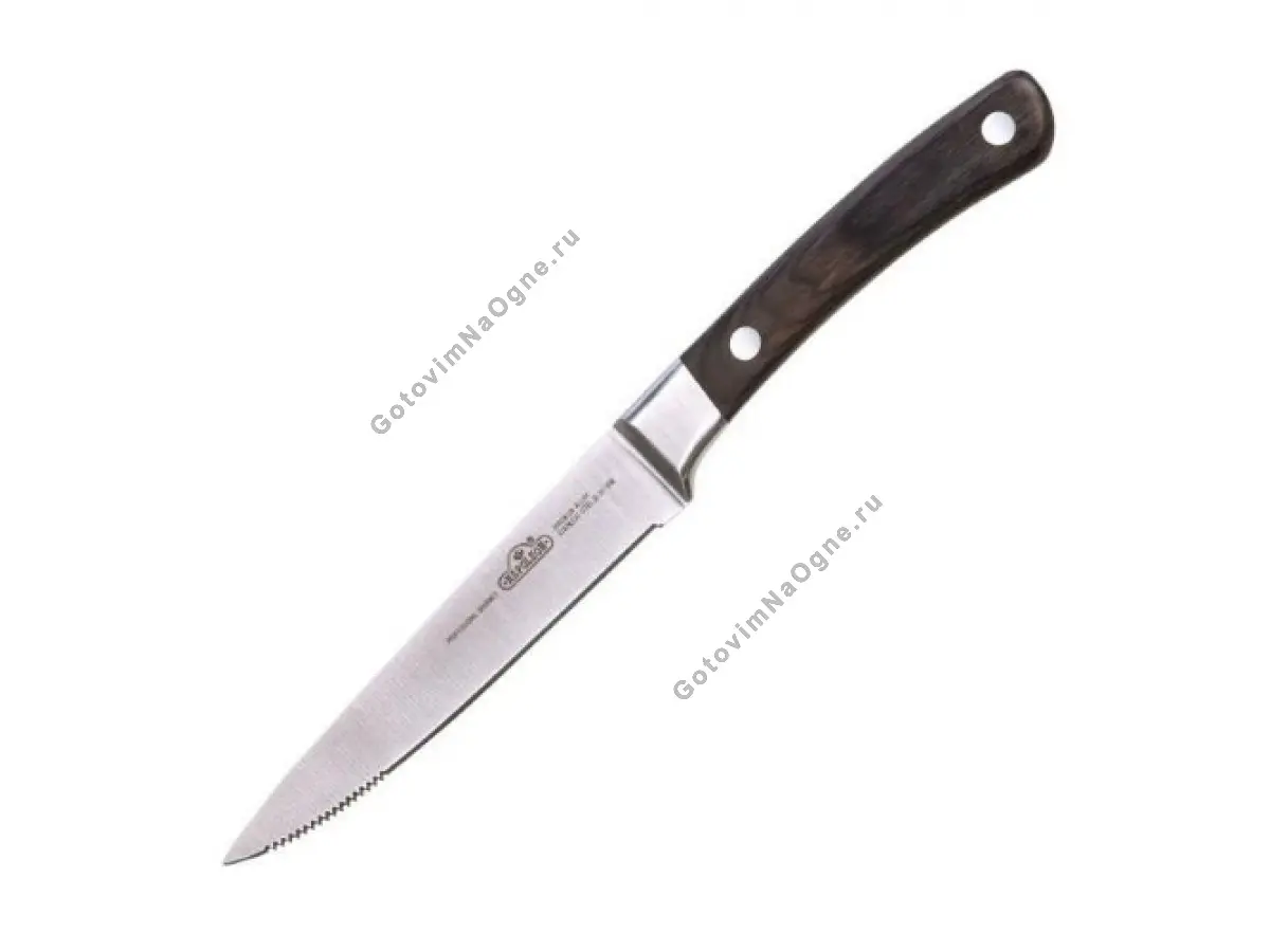 Острый нож, изготовленный из нержавеющей стали, с удобной и эргономичной деревянной ручкой. Данный нож имеет как сплошное лезвие, так и зазубренный участок клинка, предназначенный для более эффективного разрезания твердых блюд. Размеры без ручки 12,5х2,5 см.