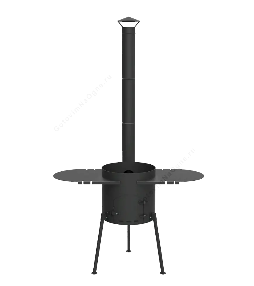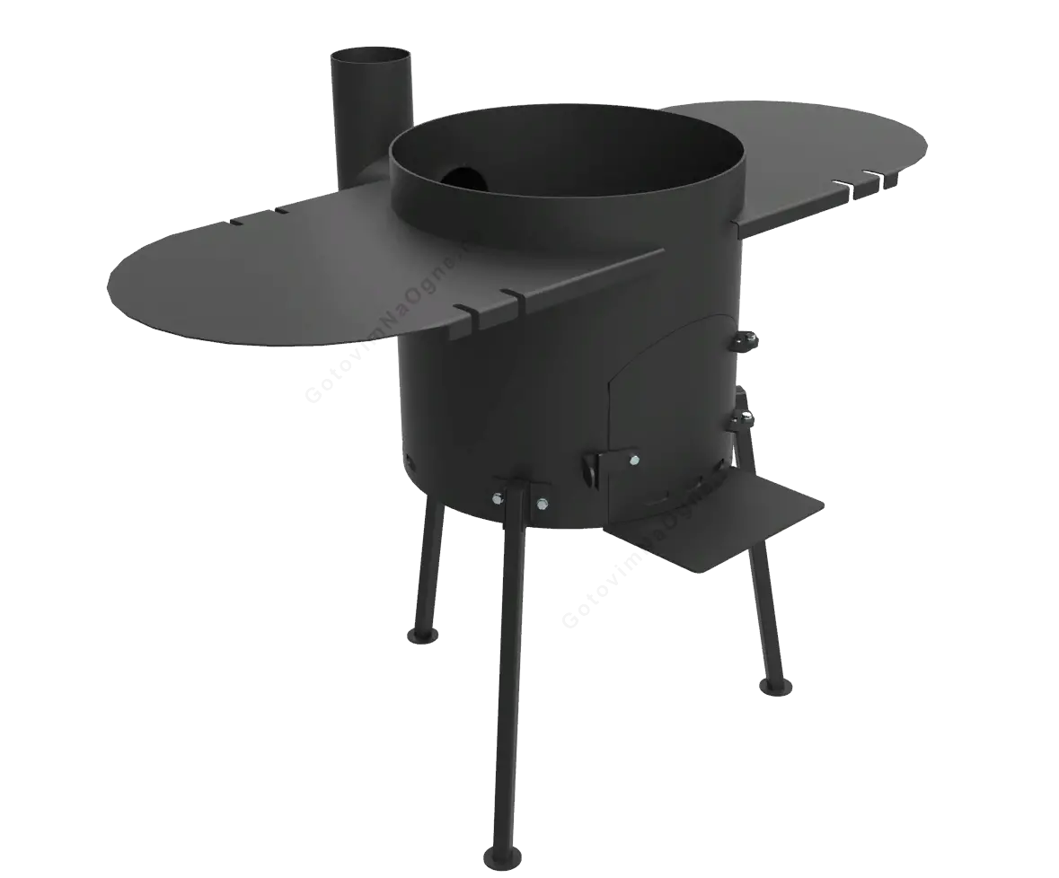 - Разборные ножки имеют плоское монтажное основание. Печь с казаном на 3 точках опоры будут ровно стоять на земле и не углубляться.
